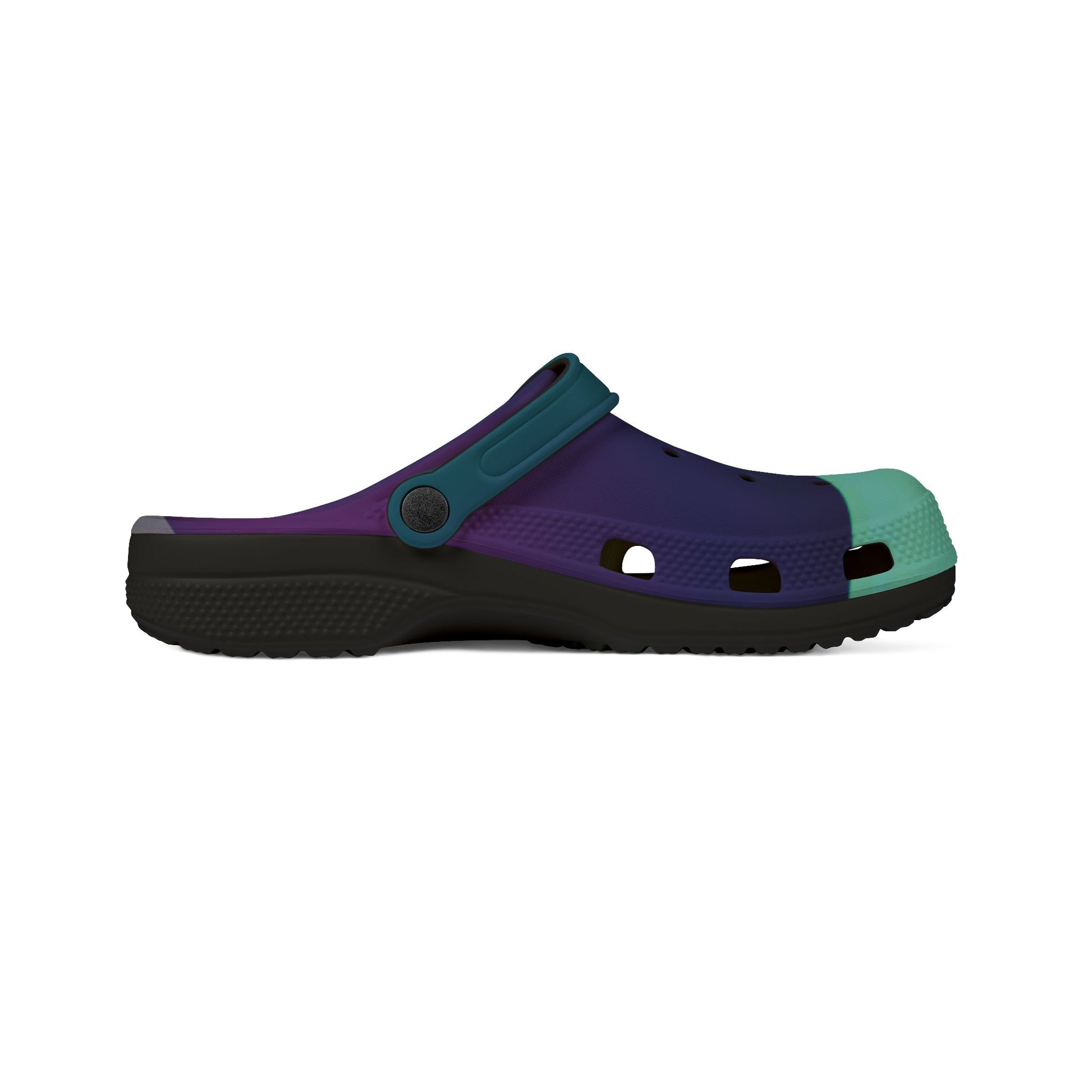 Walk boldly in what sets you apart. The Aurora Dusk clogs are more than comfort—they're a quiet declaration. With hues of heavenly teal melting into twilight purples and deep galaxy blues, each step feels like you're moving through a sky painted by divine hands.