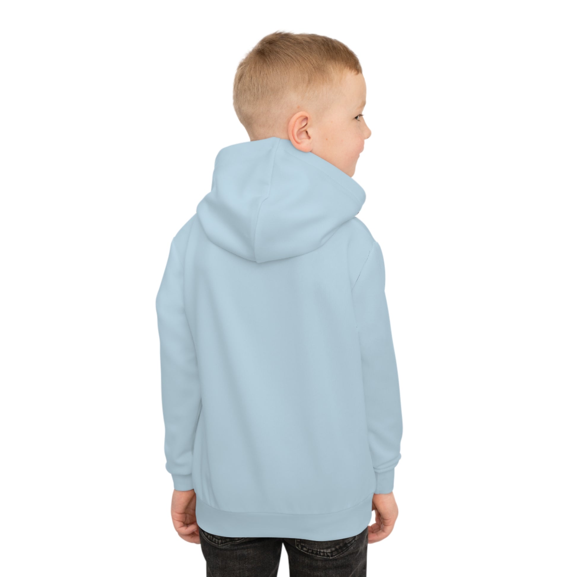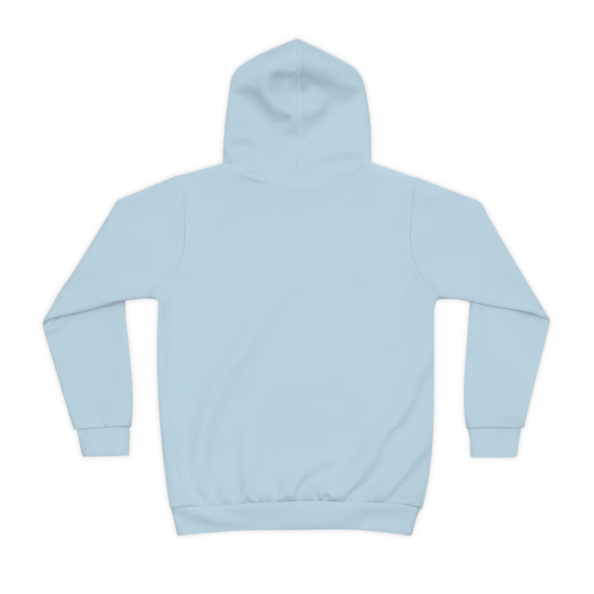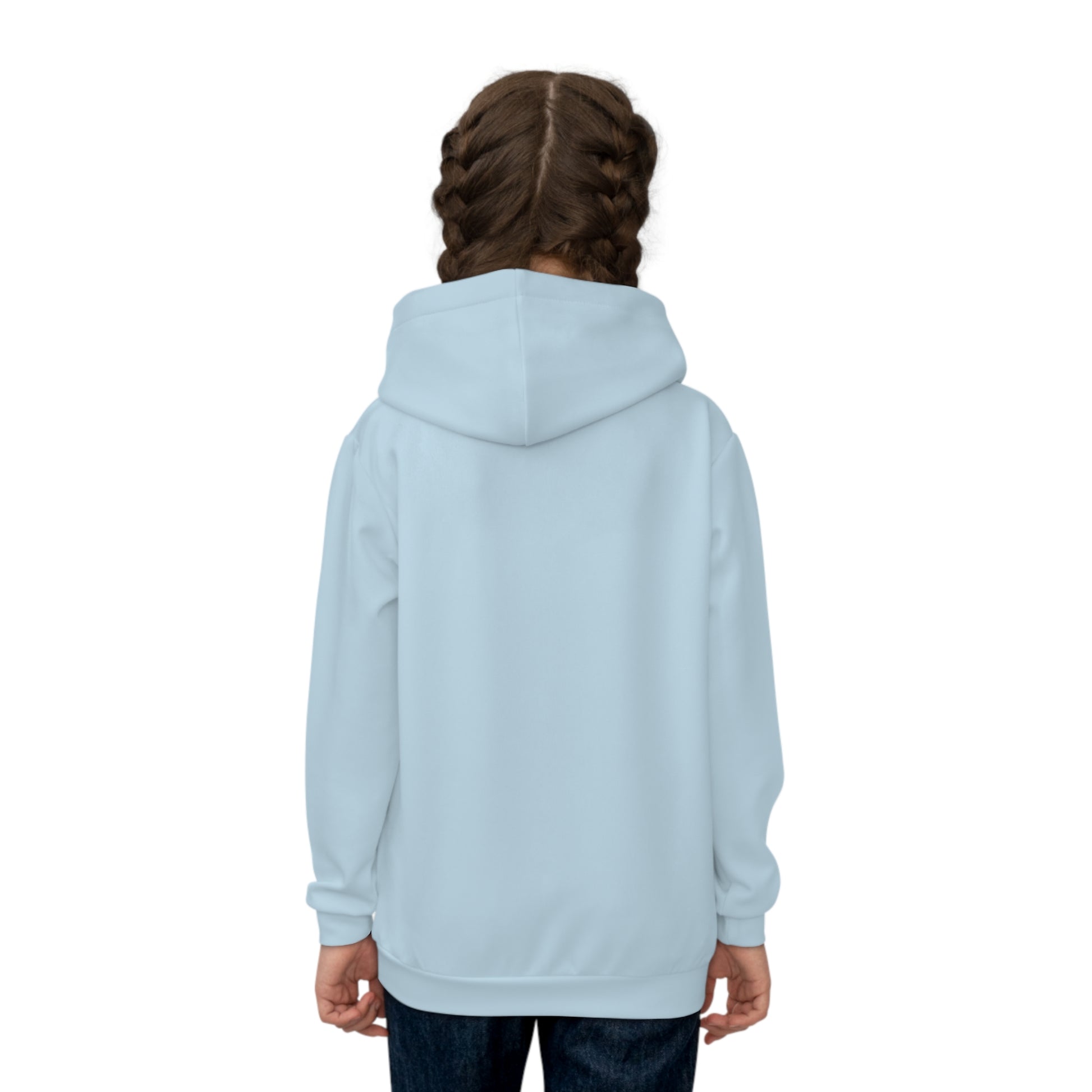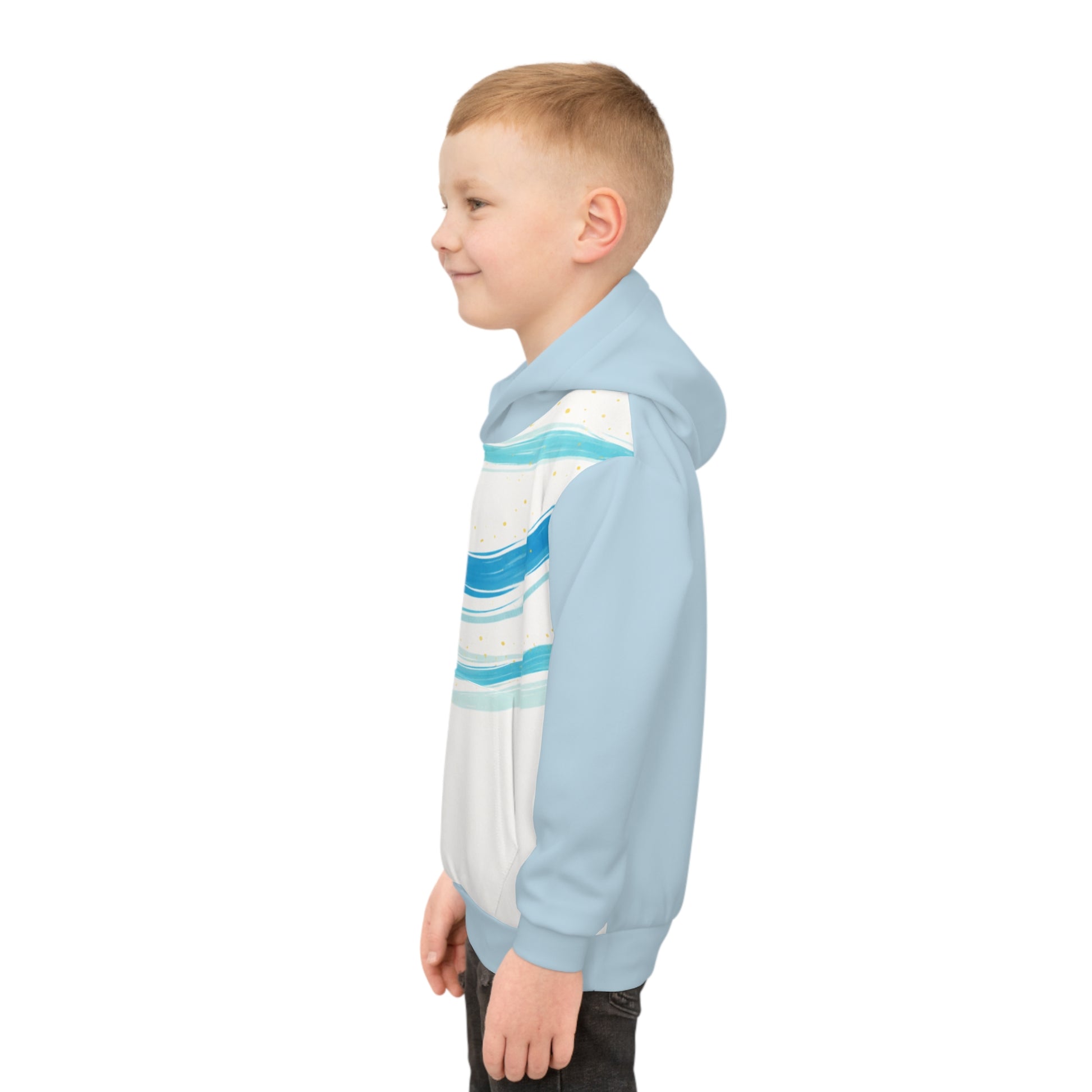 Bloomline is calm in motion—airy wave-stripes of sky and aqua flowing across a clean Cloud Dancer base, kissed with soft golden specks like sunlight catching the day. This unisex youth hoodie brings that fresh, peaceful energy to a cozy everyday layer: easy fit, soft feel, and perfect for school days, weekend hangs, and cool mornings.