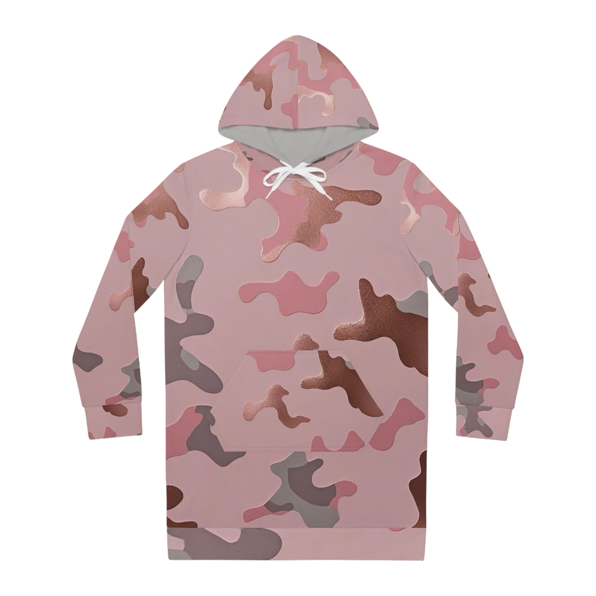 Make cozy look powerful with the Blush Battle Hoodie Dress. Wrapped in soft pink camouflage with hints of rose gold, this relaxed fit is perfect for lounging, layering, or making an effortlessly bold streetwear statement. Pockets for your essentials, a hood for your mood.