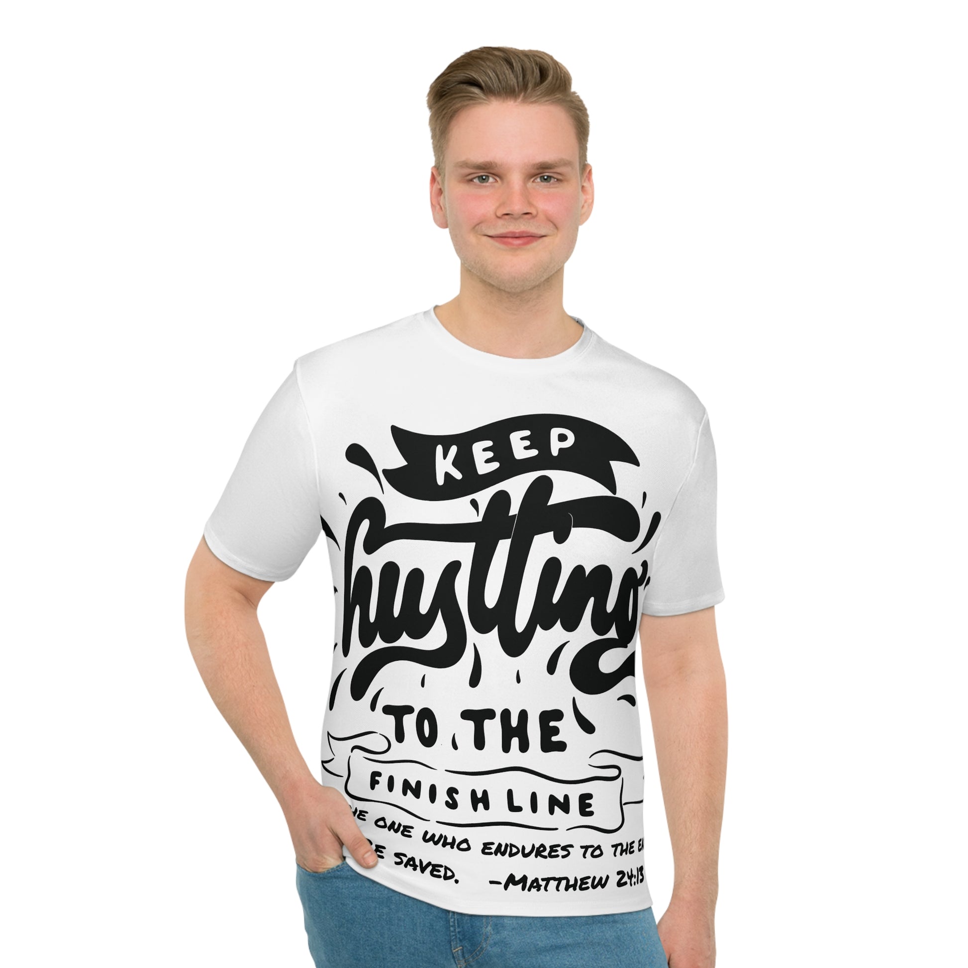 Push through the trials and finish the race with faith. This bold graphic tee features the empowering message “Keep Hustling to the Finish Line,” anchored by Matthew 24:13 – “But the one who endures to the end will be saved.” A powerful reminder to stay the course, trust the Most High, and never give up.