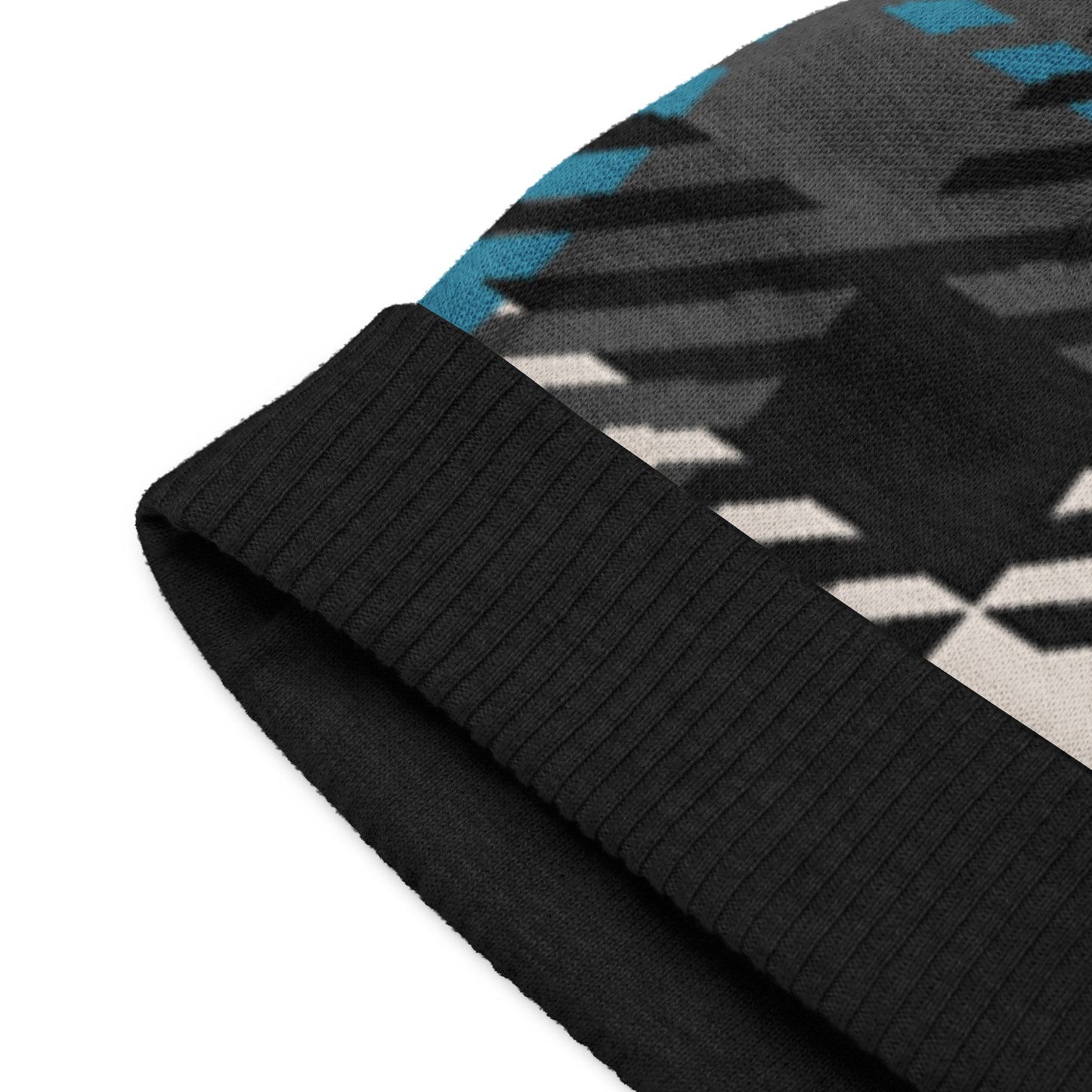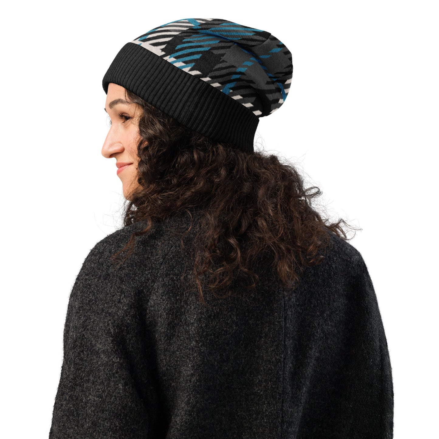 Wrap your thoughts in warmth and bold intention. The Frozen Echo beanie showcases the signature blocky tartan in gamma blue, charcoal black, and stone beige—woven together like prayers whispered into wintry winds. With a thick, ribbed cuff for a snug fit and a design that turns cold into cool, this knit beanie isn’t just outerwear—it’s messagewear for the mind. Designed for those who move through frozen seasons with heat in their spirit.