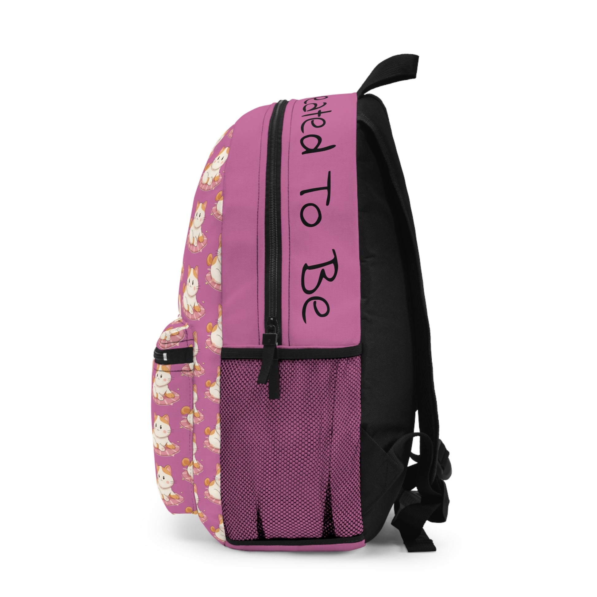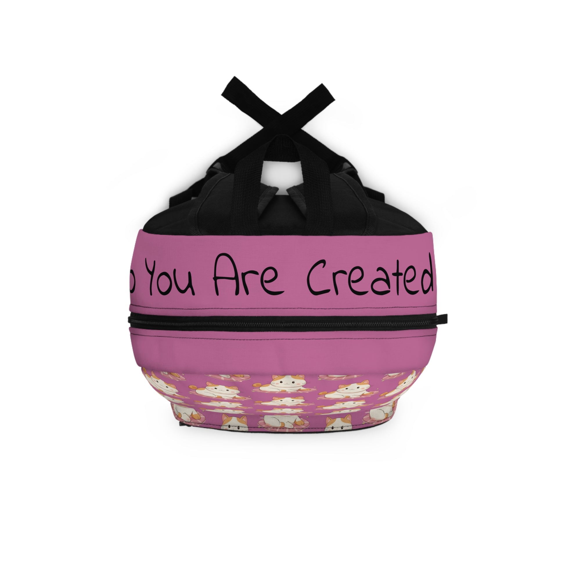 Add a little “aww” to your adventure! This adorable backpack features a sweet, chubby cat lounging in cuteness overload. With a backdrop of playful pink and a message that reads “Be Who You Are Created To Be,” it's the purr-fect reminder to stay true to your divine design—one paw-sitive step at a time.