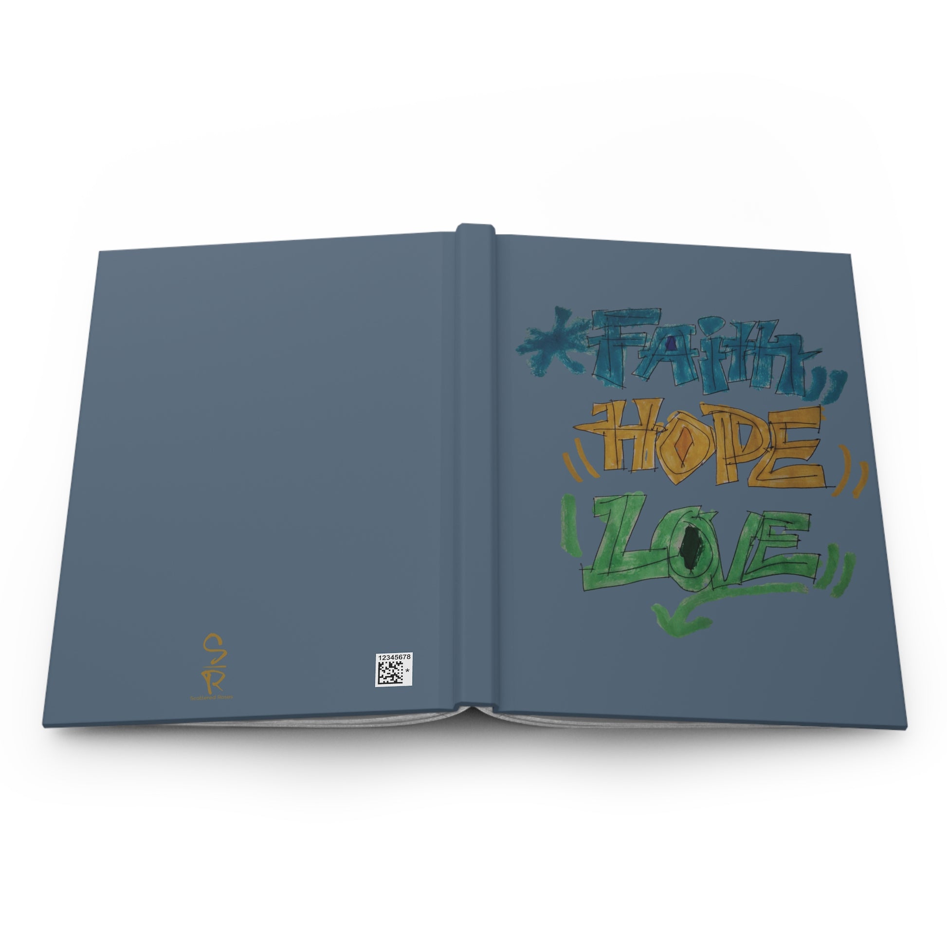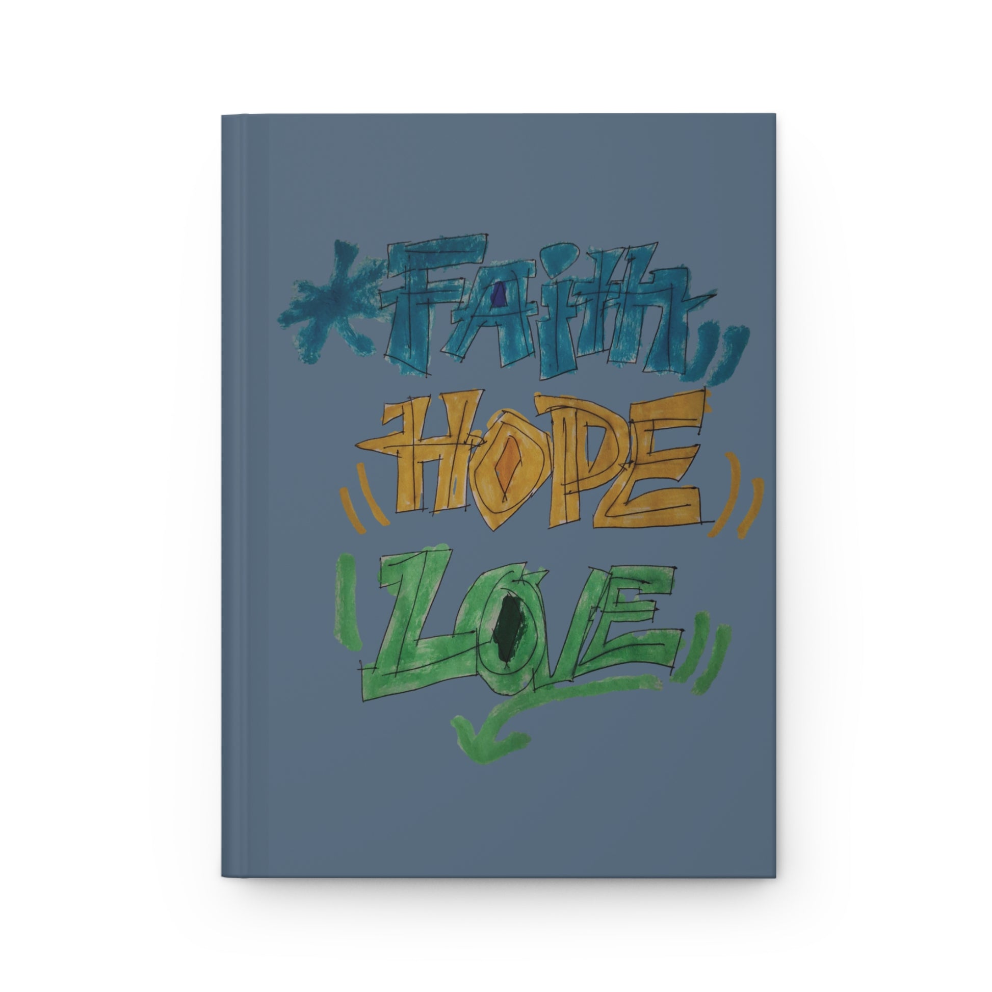 Creative, calm, and full of expression, this Faith Hope Love journal pairs hand-drawn artwork with a slate blue cover for a polished and distinctive finish. The muted blue tone feels thoughtful and modern while still allowing the artwork to remain the center of attention. Designed for notes, prayers, reflections, goals, and everyday writing, this journal brings color, encouragement, and messagewear energy to your routine under the covering of The Most High.