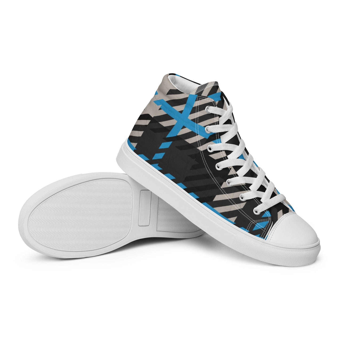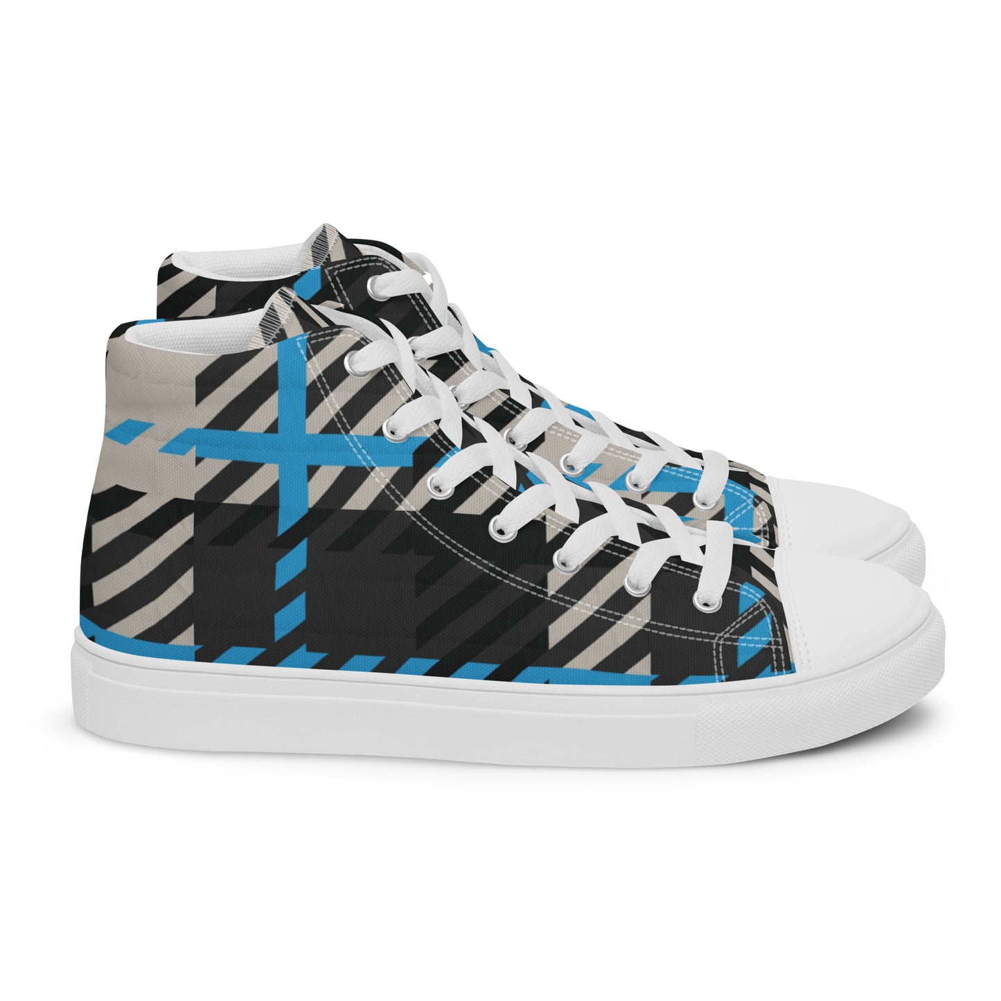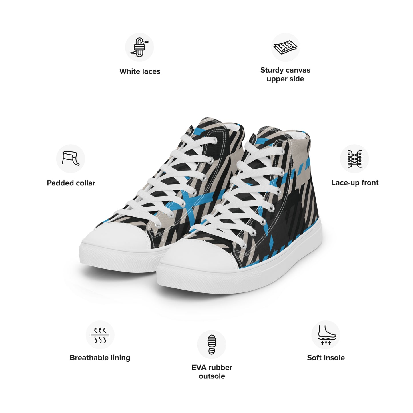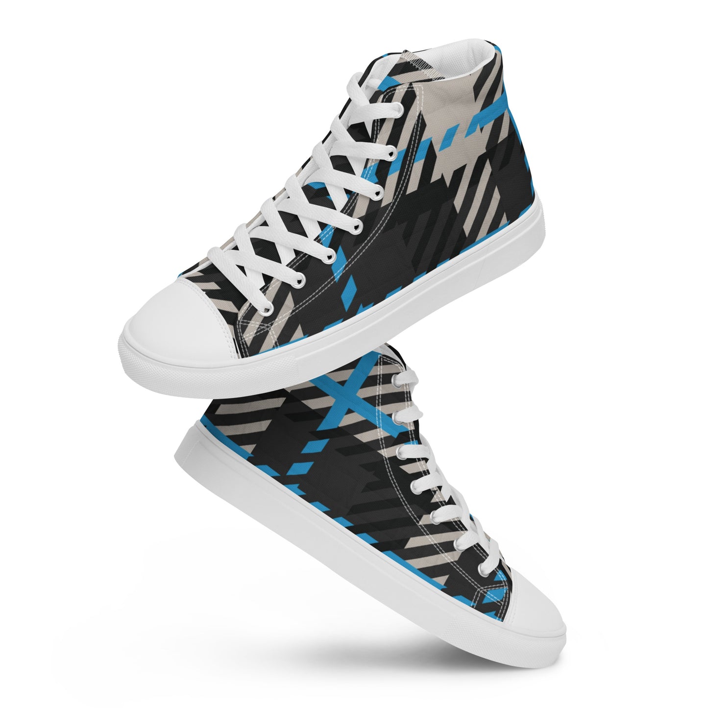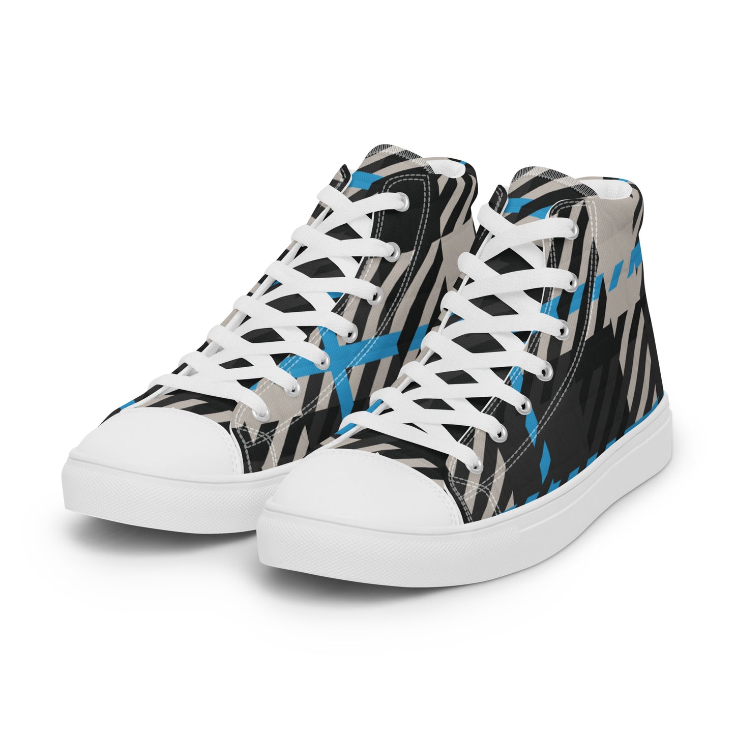 Stride boldly into the season with the Frozen Echo high-top sneakers in the White Trim Edition — where modern plaid meets poetic purpose. Featuring the original Frozen Echo pattern — a dynamic remix of icy gamma blue, stone beige, charcoal black, and black — this design echoes strength, stillness, and the call to keep moving forward even when the world slows down. The crisp white foxing, eyelets, and laces add a clean contrast that speaks of clarity amidst the noise.