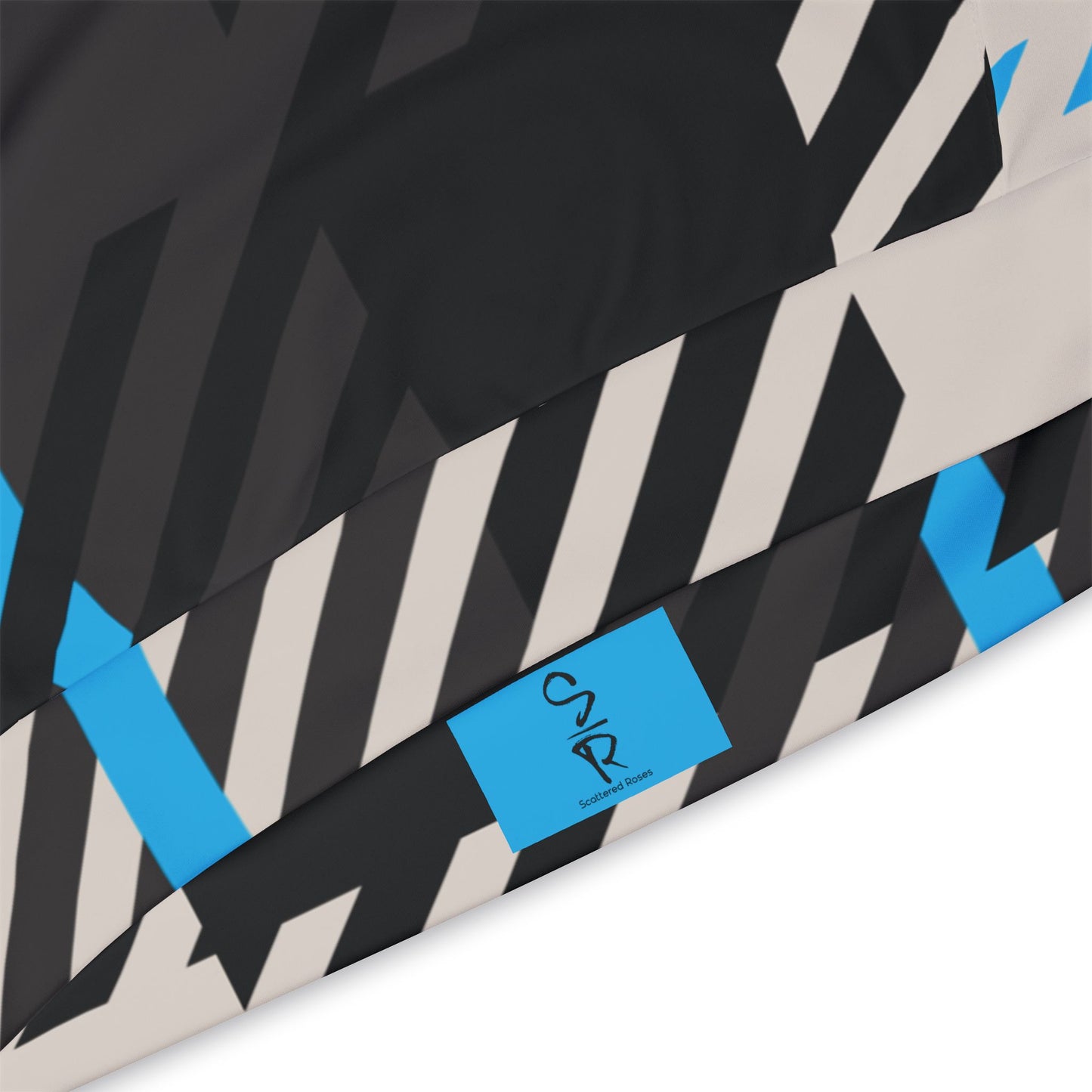 The bold rhythm of gamma blue lines against stone beige and charcoal fields reflects the tension between stillness and strength, softness and resilience. With every stripe and diagonal, it speaks a message: