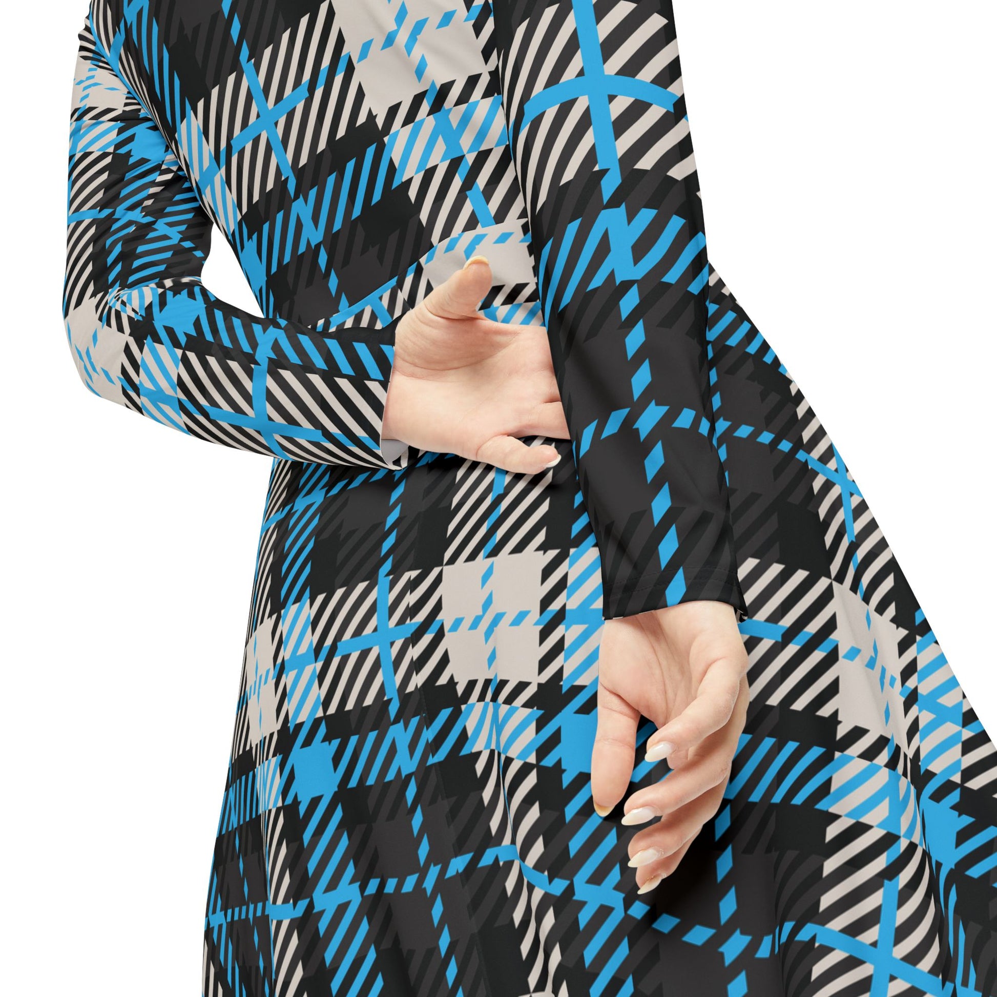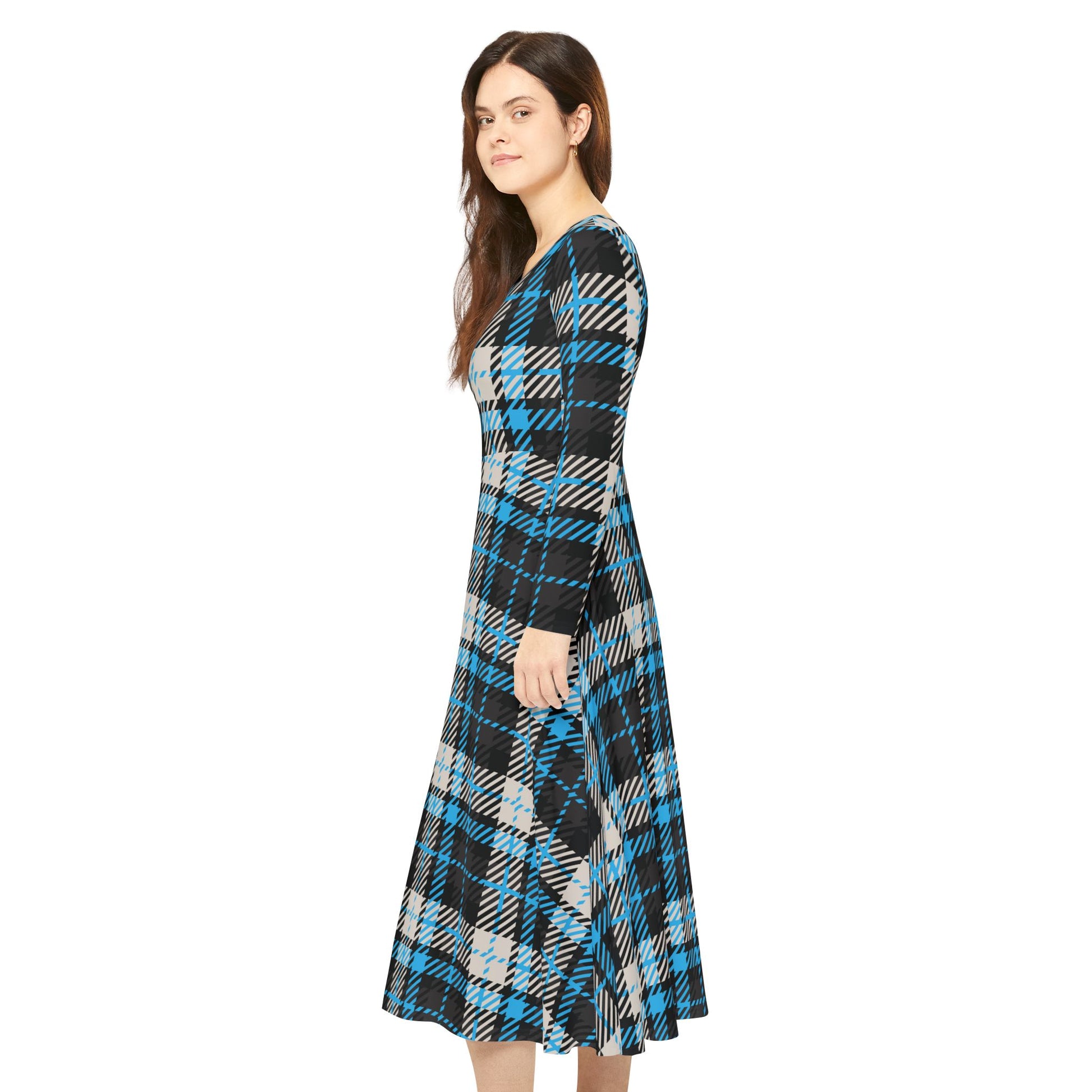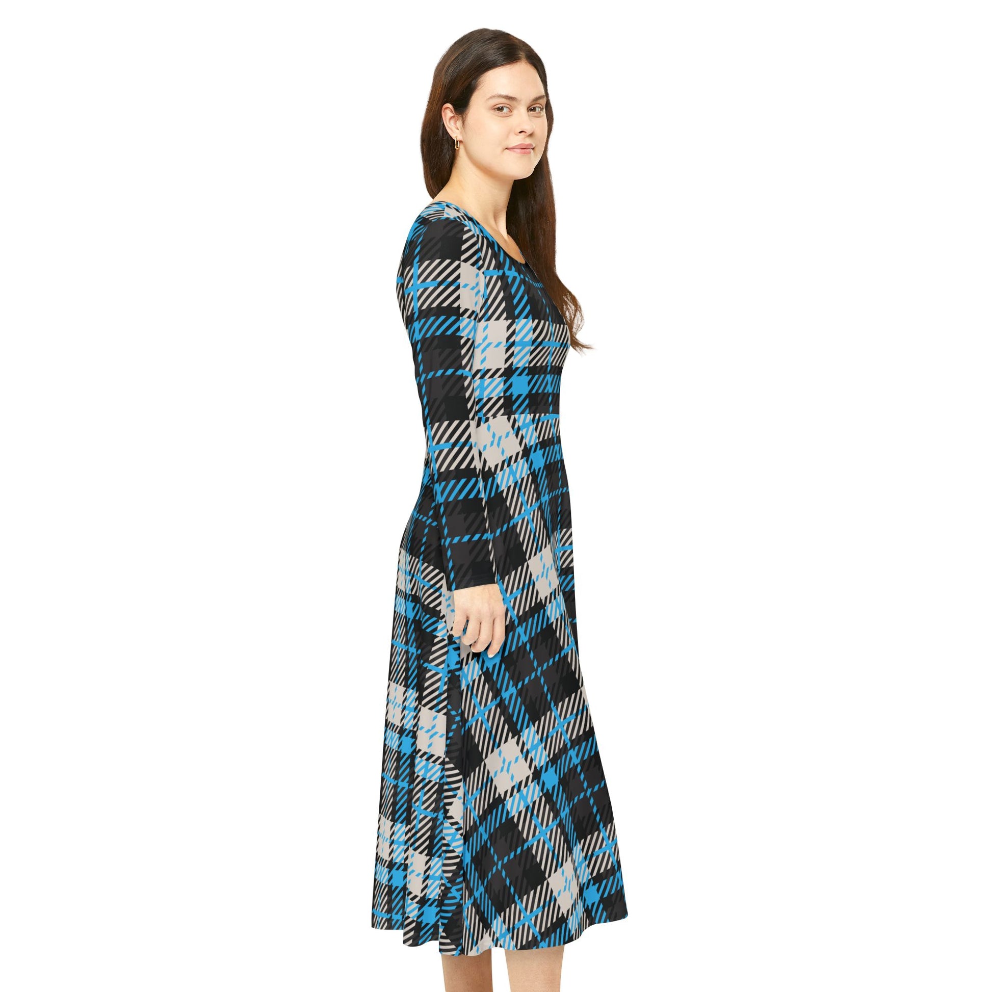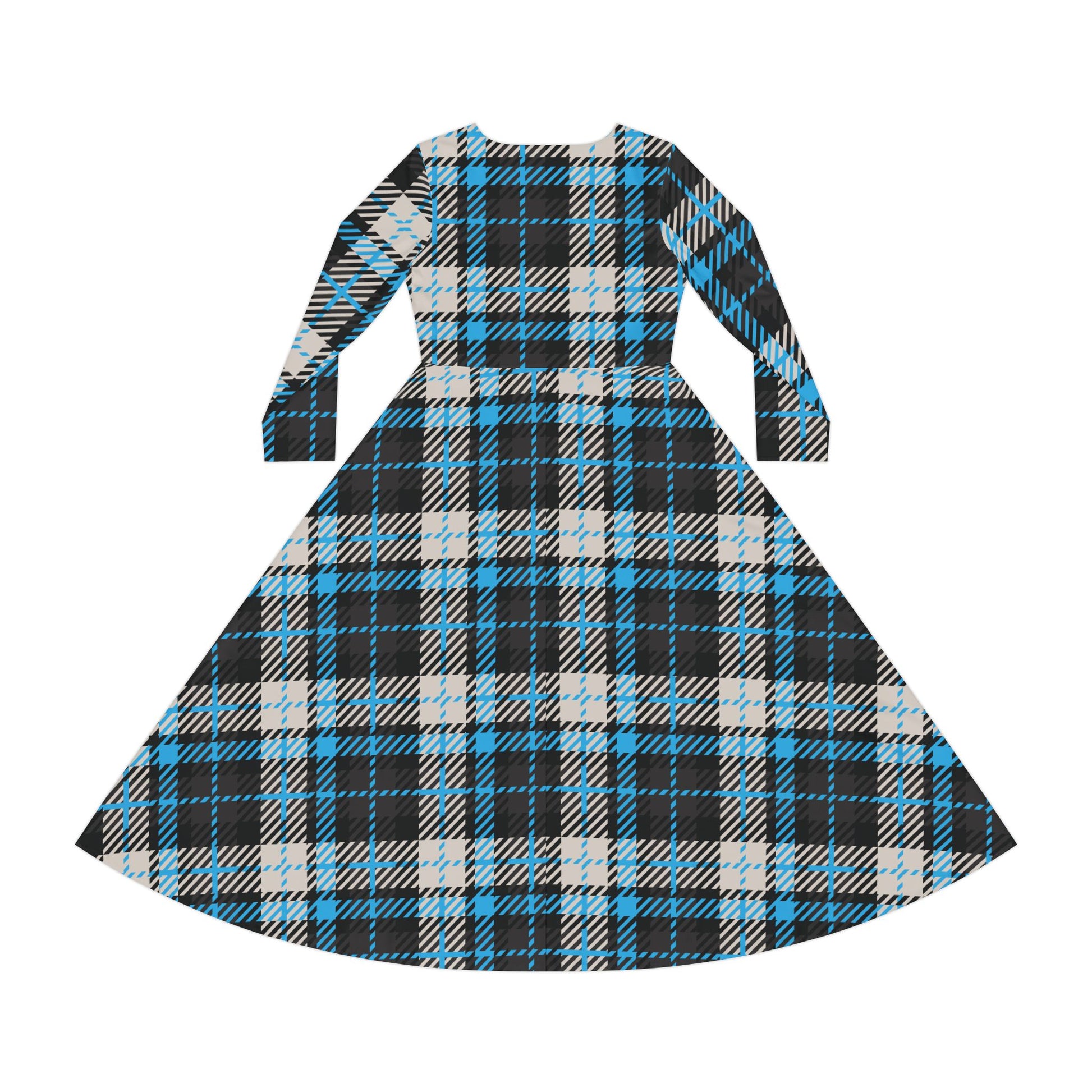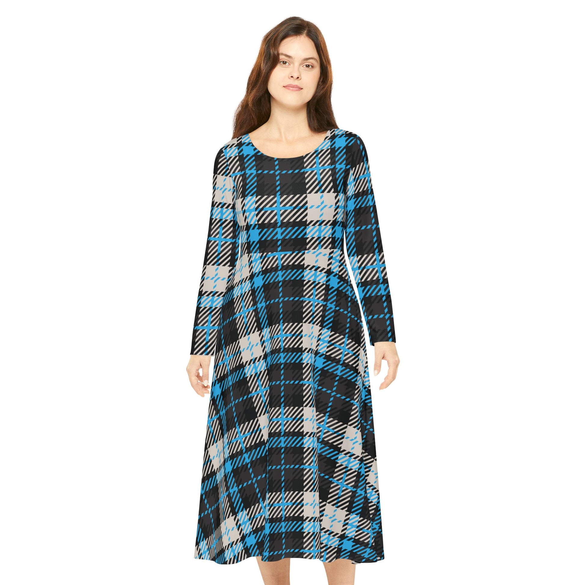 Let your style speak in stillness with the Frozen Echo midi dress. Designed in our signature winter tartan, this long sleeve silhouette brings structure and grace to colder days. Gamma blue lines echo across a field of charcoal black, stone beige, and soft winter white — a pattern born of clarity, confidence, and quiet strength. Flowing with ease yet grounded in presence, this piece belongs to the ones who carry peace into chaos.