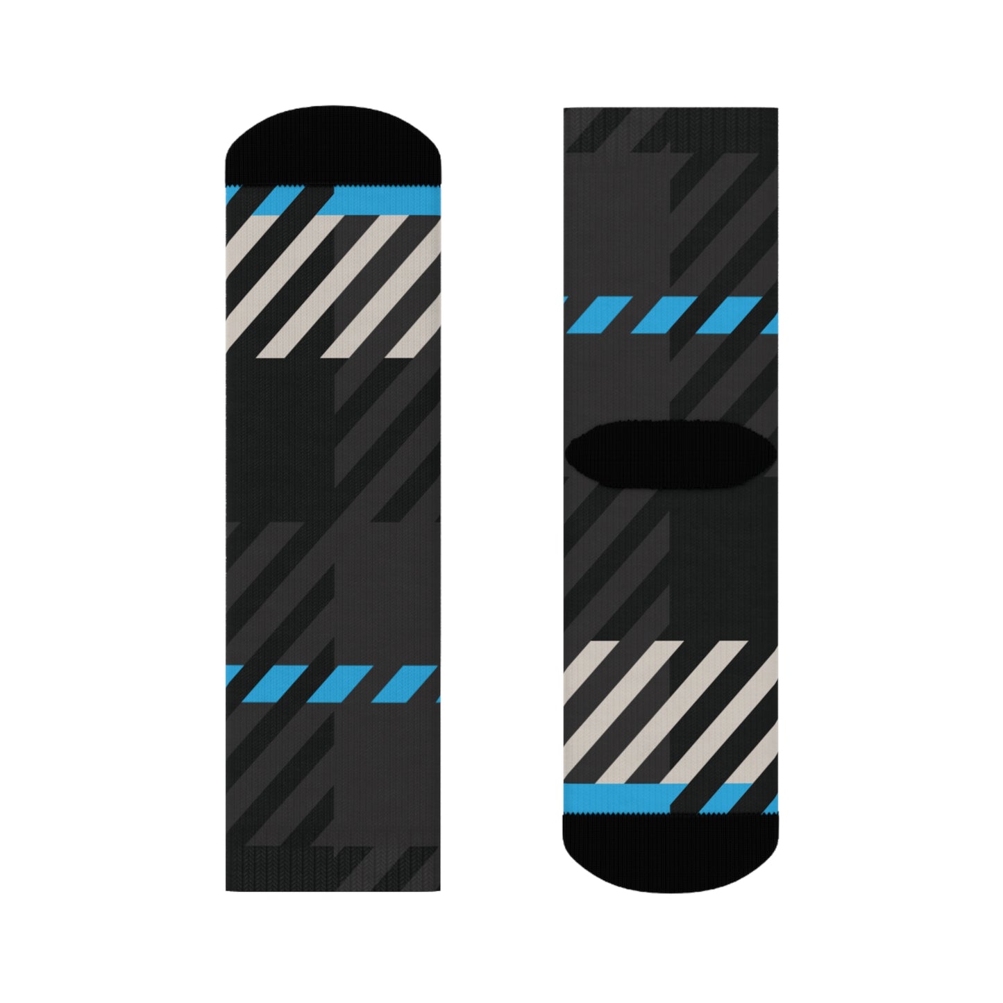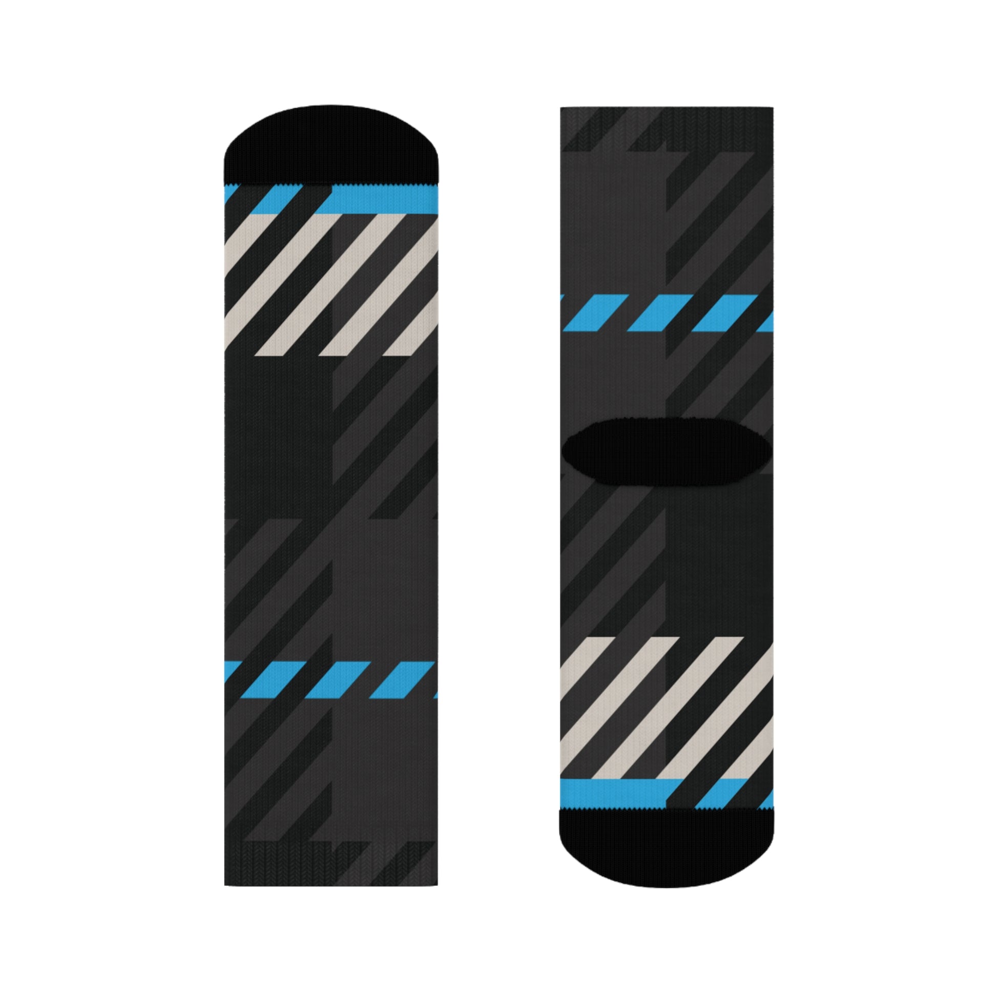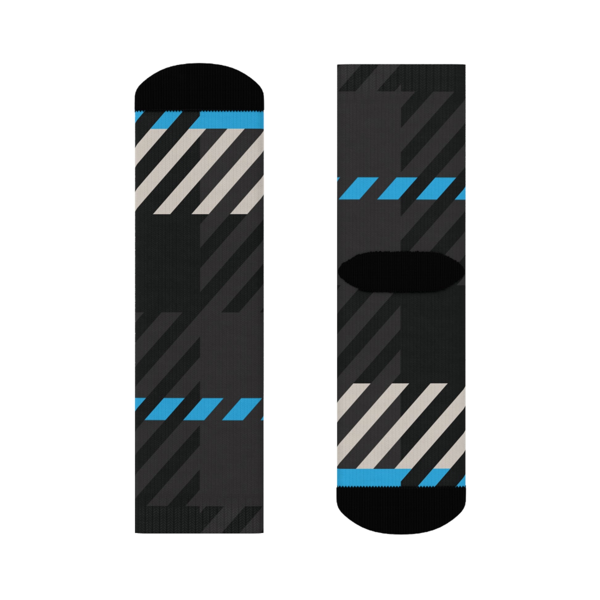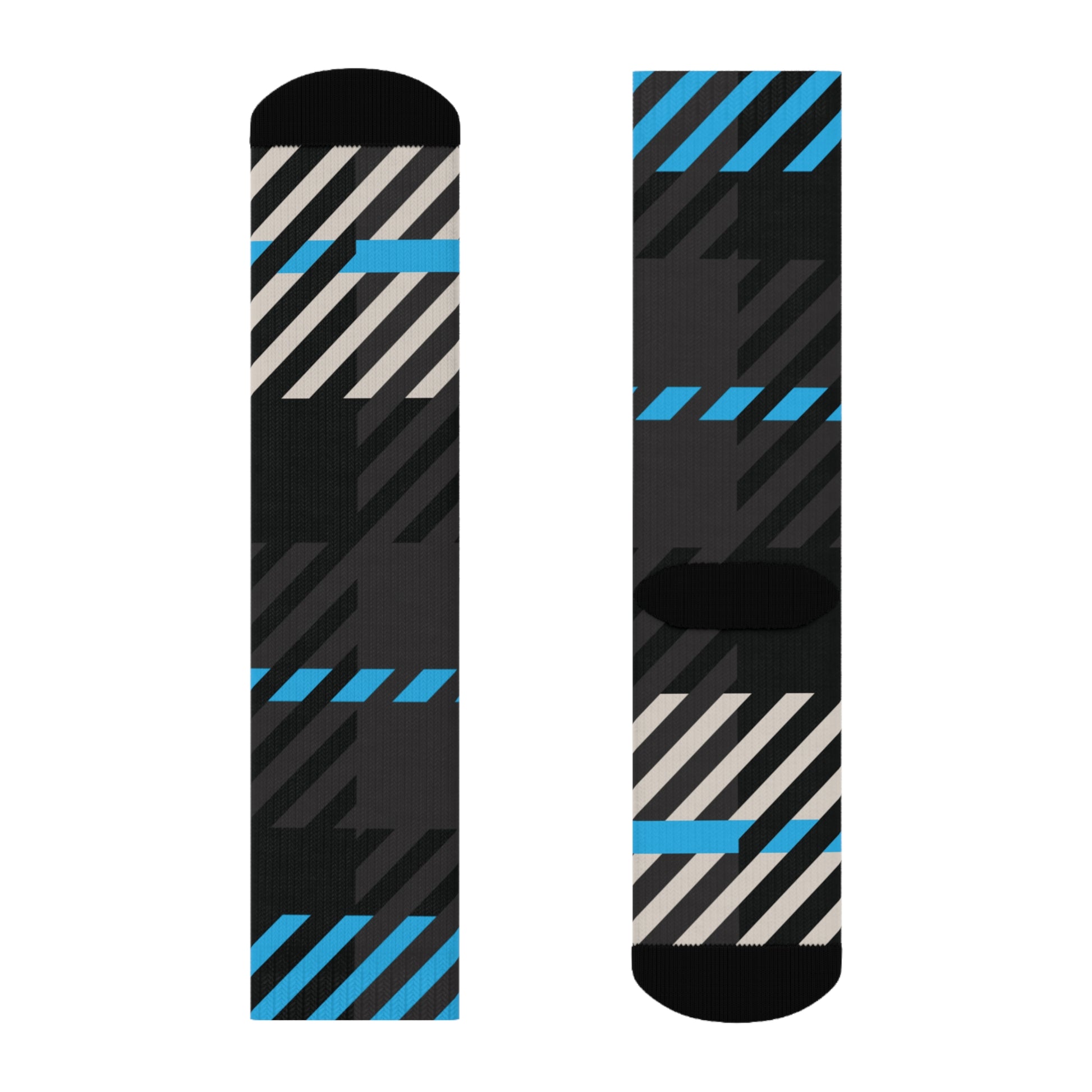 The abstract tartan design weaves together Gamma Blue, stone beige, and charcoal black in a rhythm of alignment and quiet strength—perfect for pairing with leggings, joggers, or layered winter fits from the full Frozen Echo collection. Whether peeking out from under boots or carrying the look solo, these socks were designed to remind you that every step is ordered.