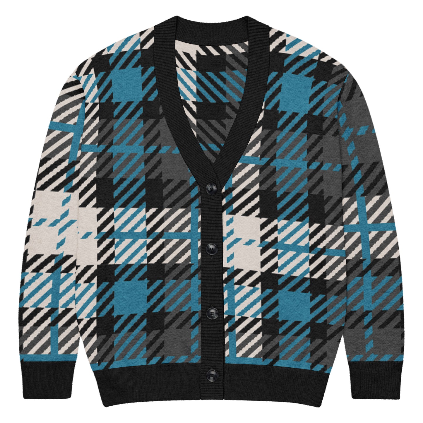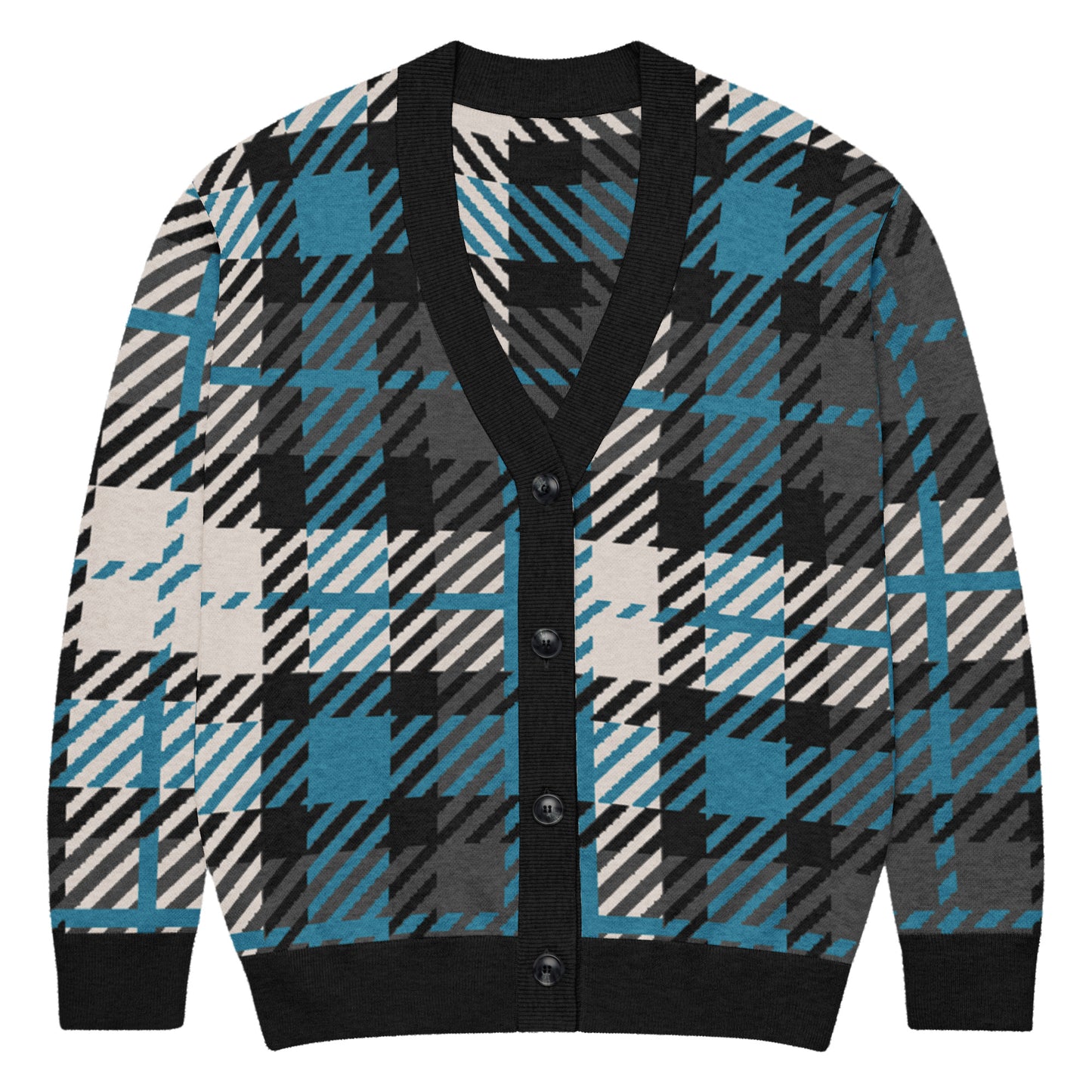 When the air sharpens and the winds whisper stories of endurance, the Frozen Echo cardigan answers with warmth and edge. This knit piece wraps you in the bold rhythm of a season carved in stone and softened by snow—blocky lines meet a stormy palette of charcoal black, stone beige, and gamma blue, echoing the strength of stillness.