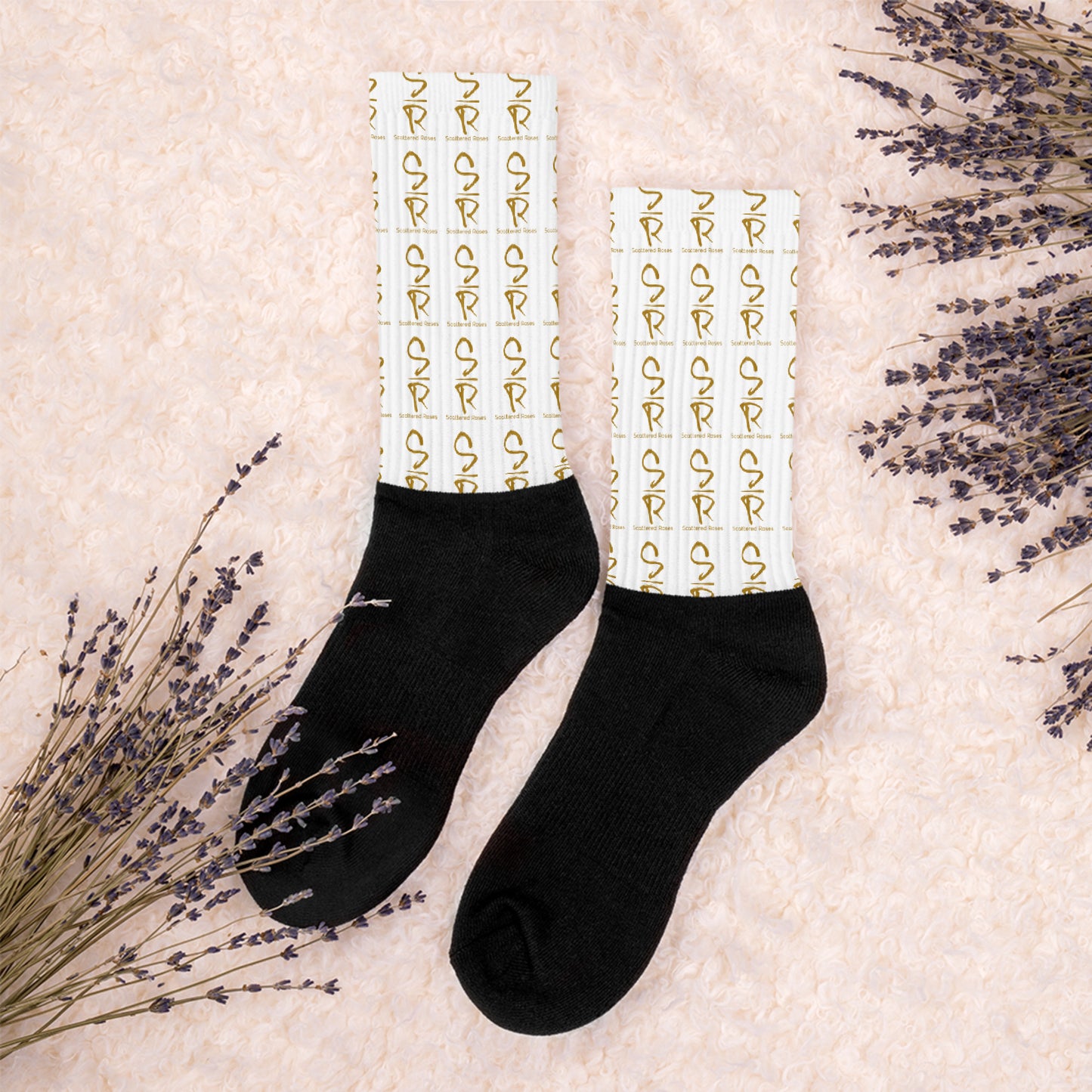 Elevated in every detail. These Every Step Ordained socks feature the Scattered Roses (SR) insignia in a regal gold repeat print, set against a clean white backdrop with a solid black base. Bold yet refined, they embody affordable luxury and the quiet power of walking in purpose.