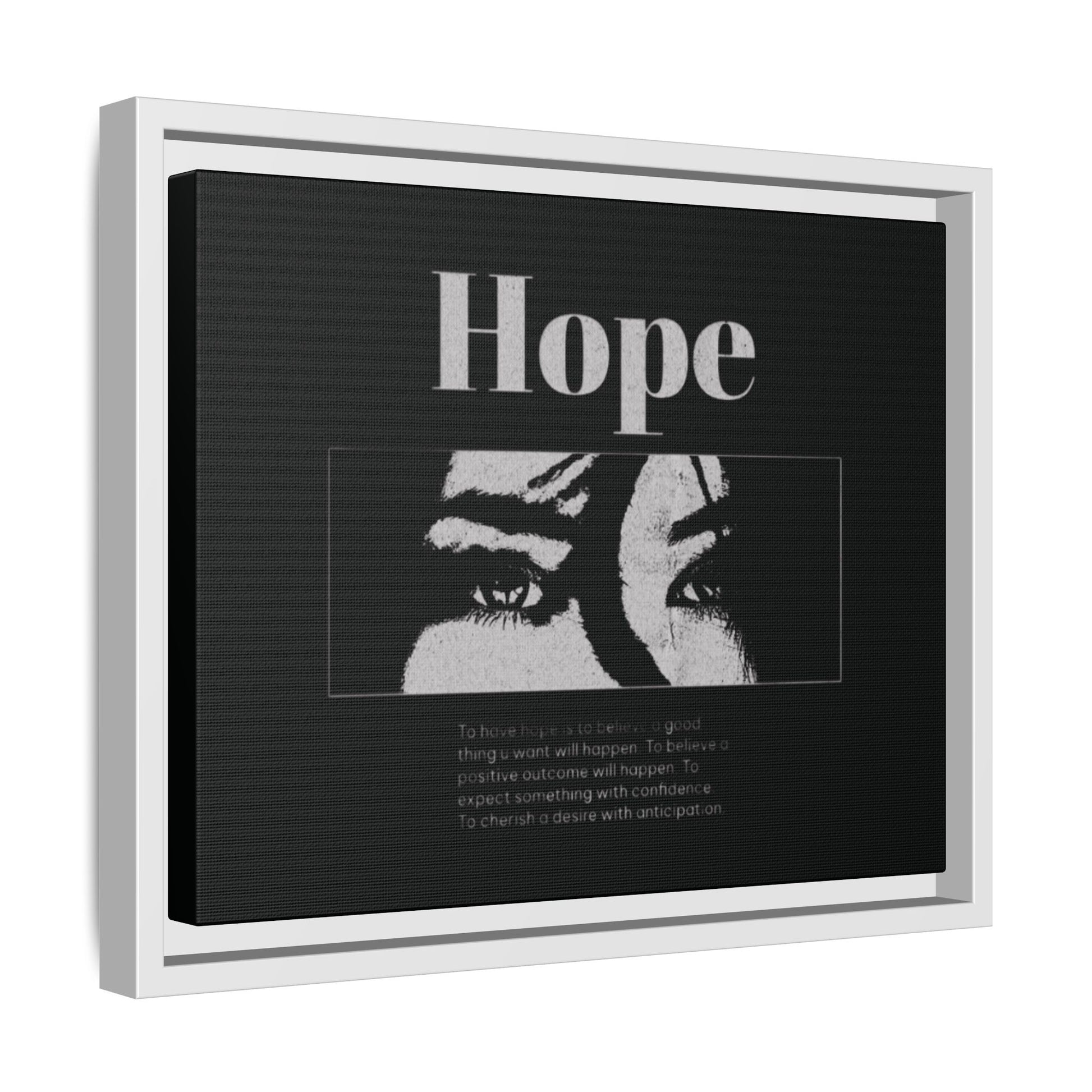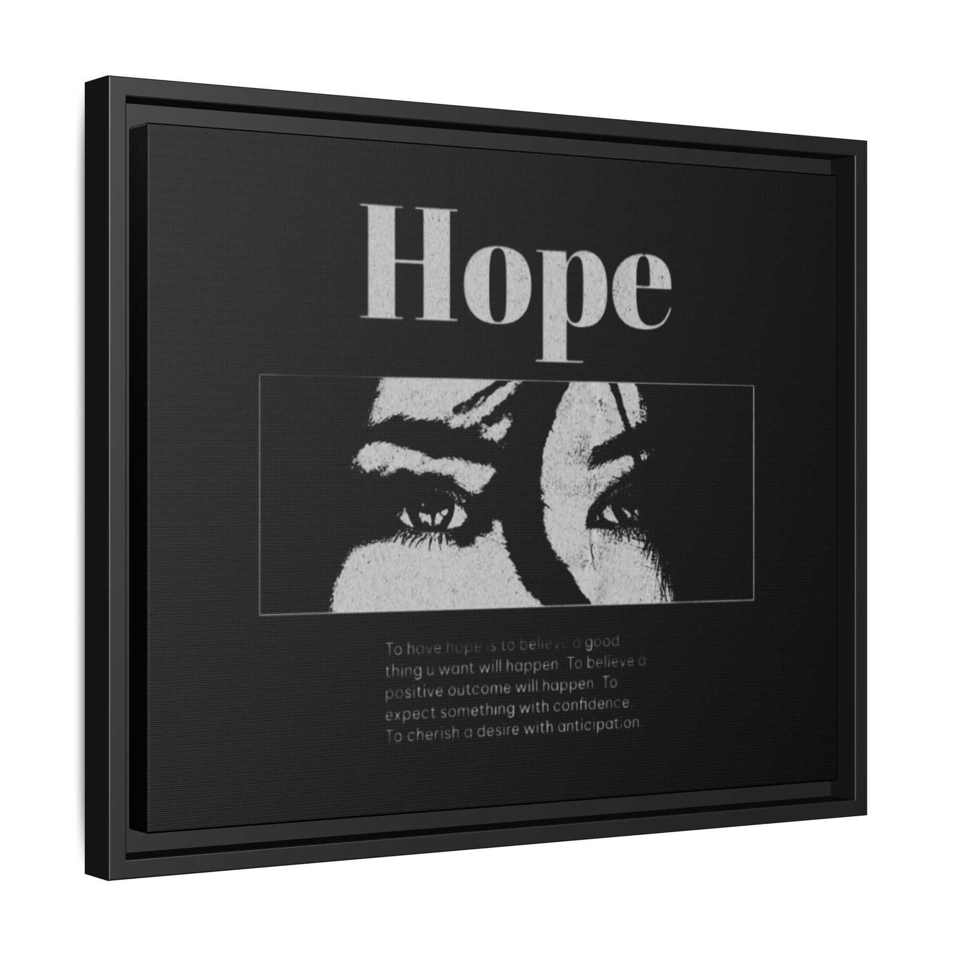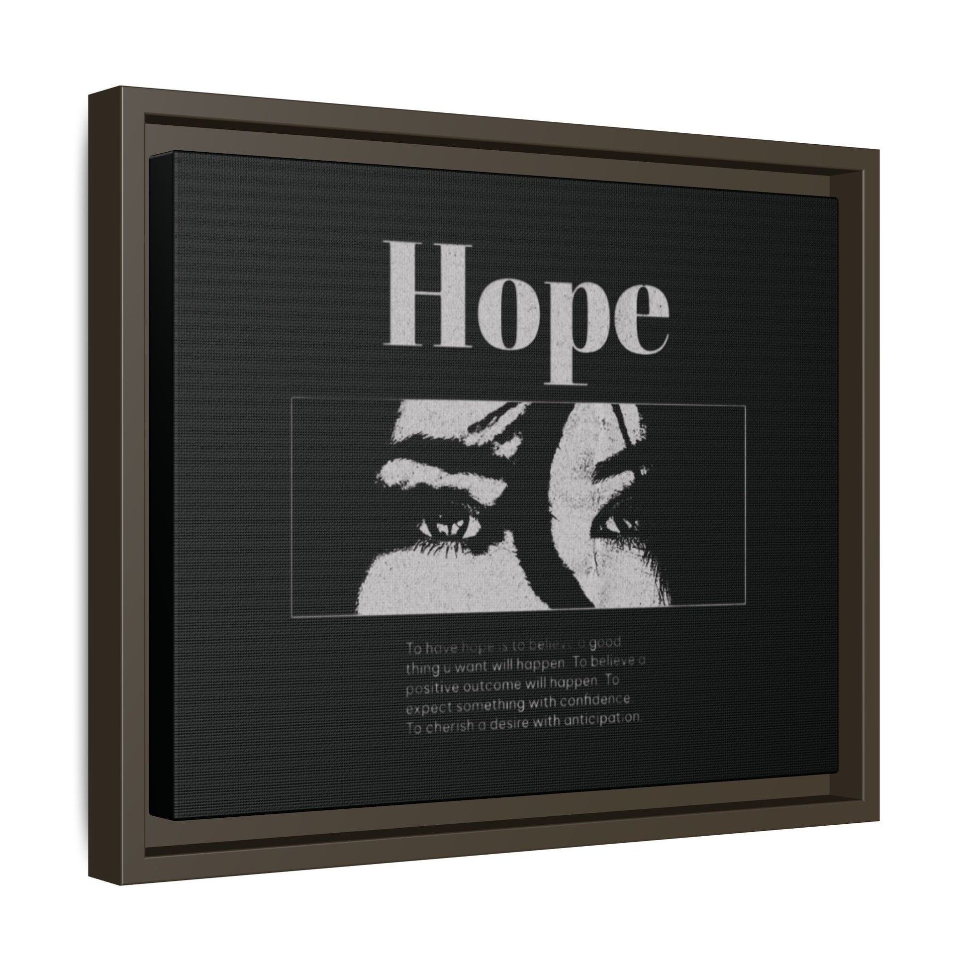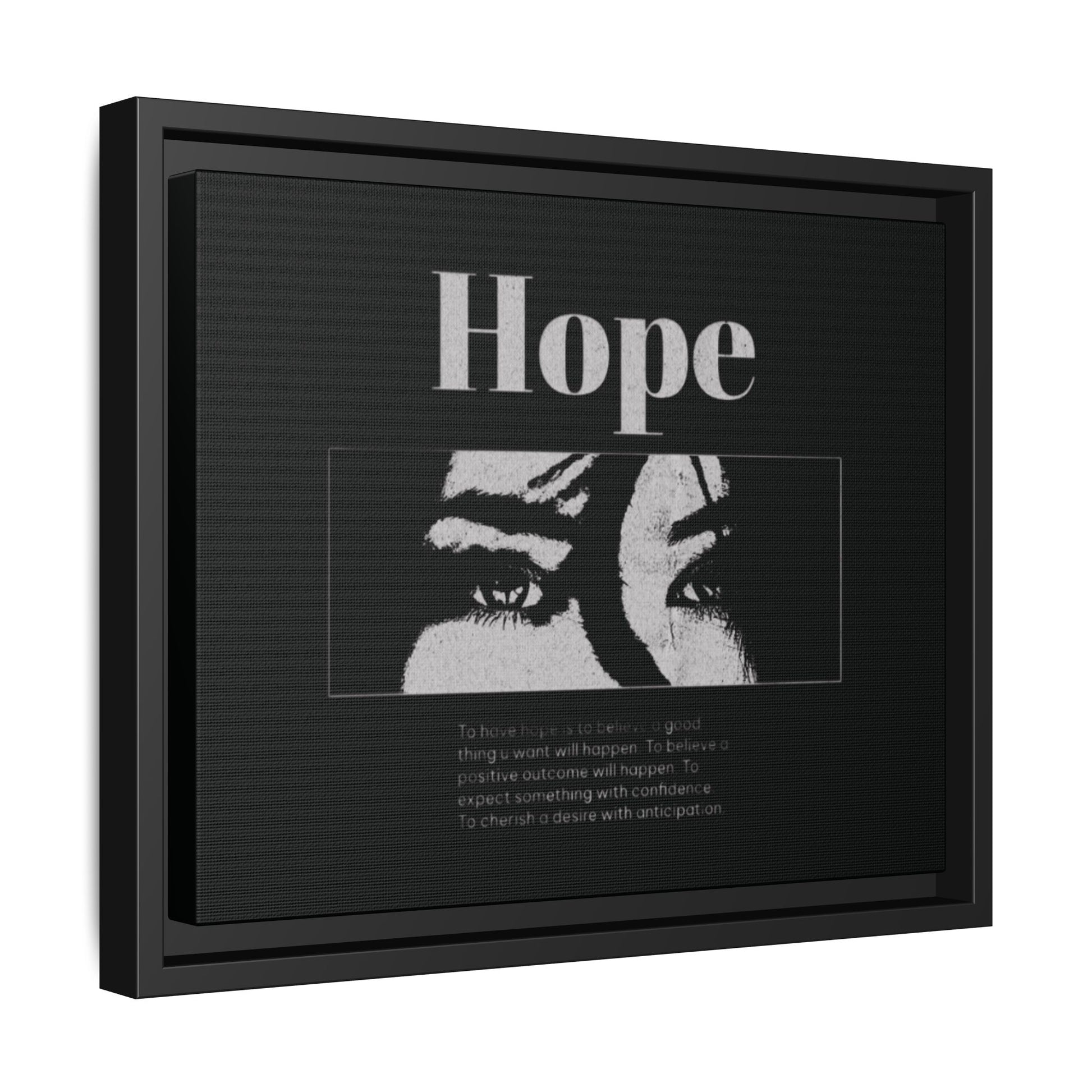 With shadowed eyes and bold serif lettering, this striking piece titled Hope captures the tension of expectancy in a broken world. The grayscale design, centered on a solemn gaze, anchors you in the quiet belief that something better is always coming.