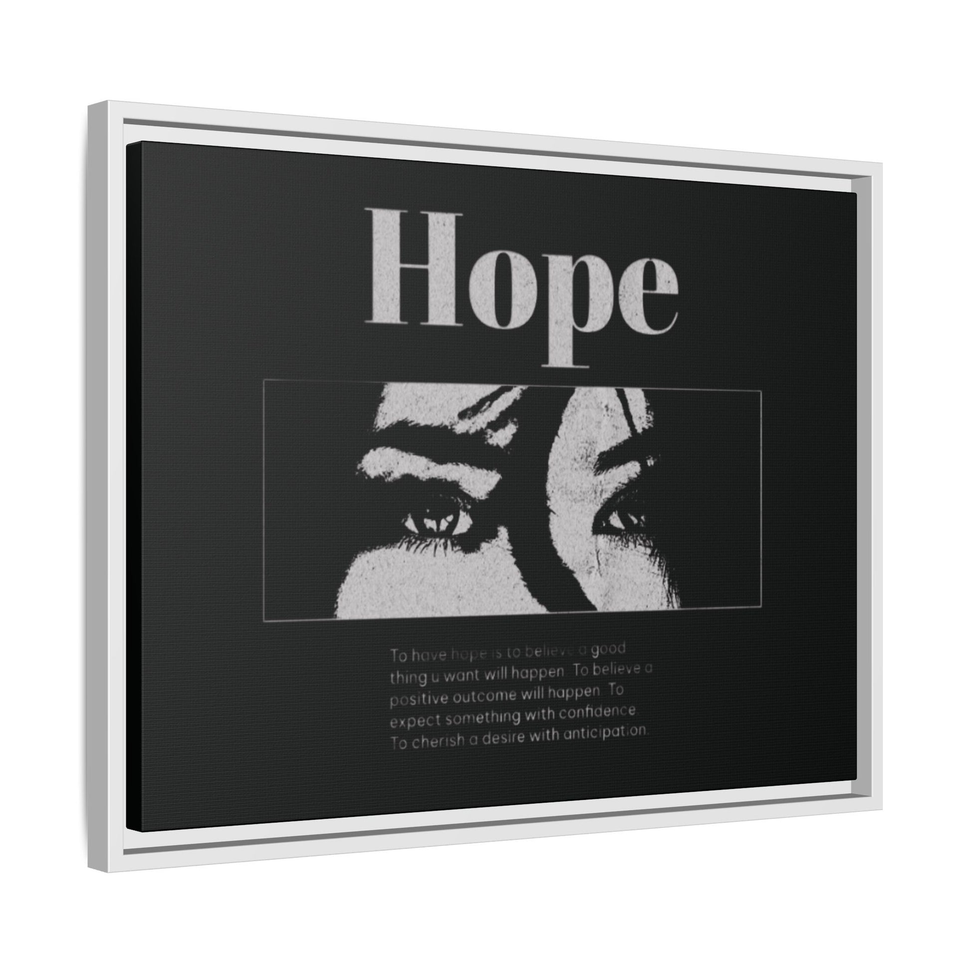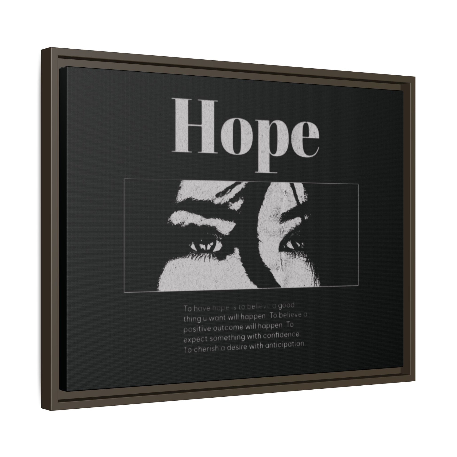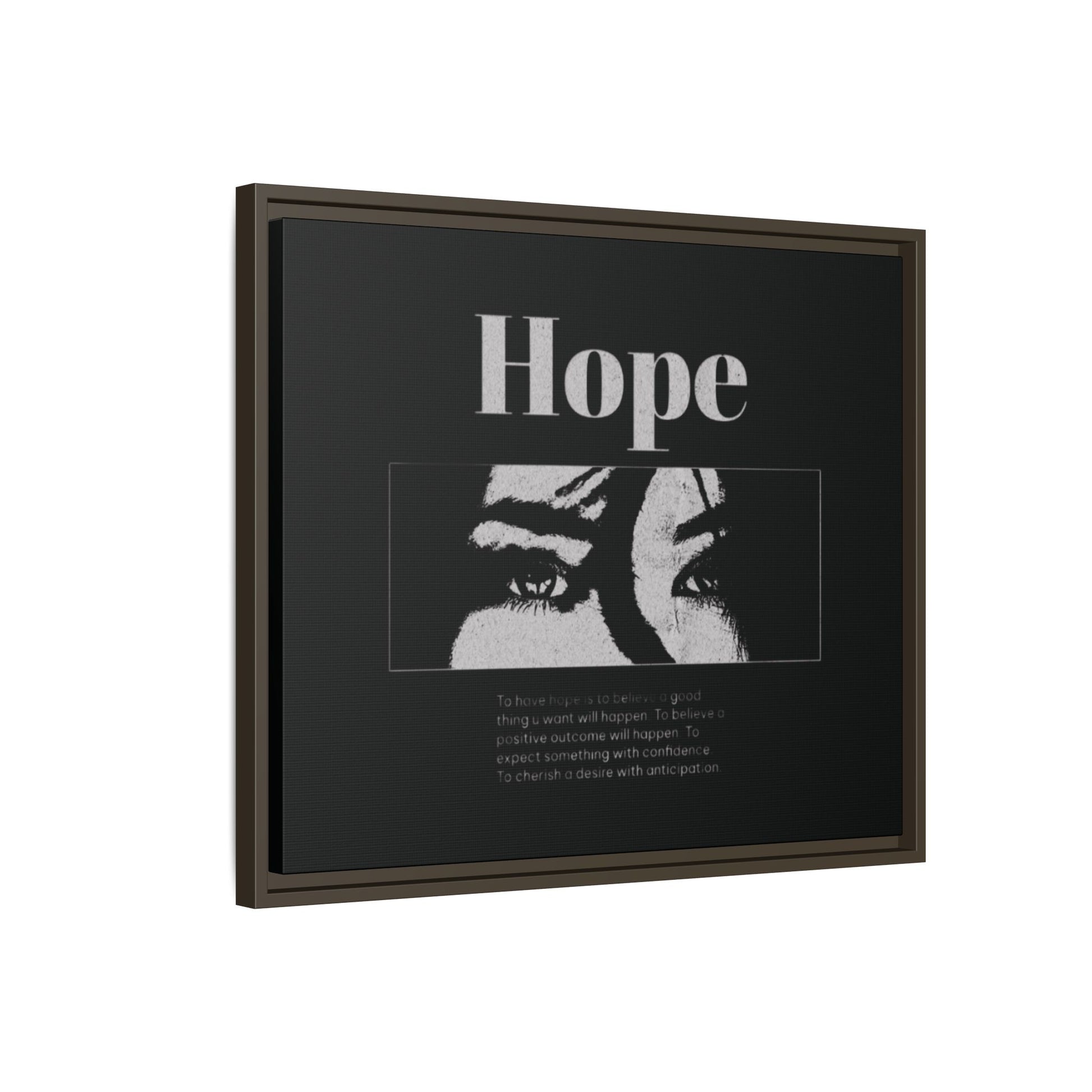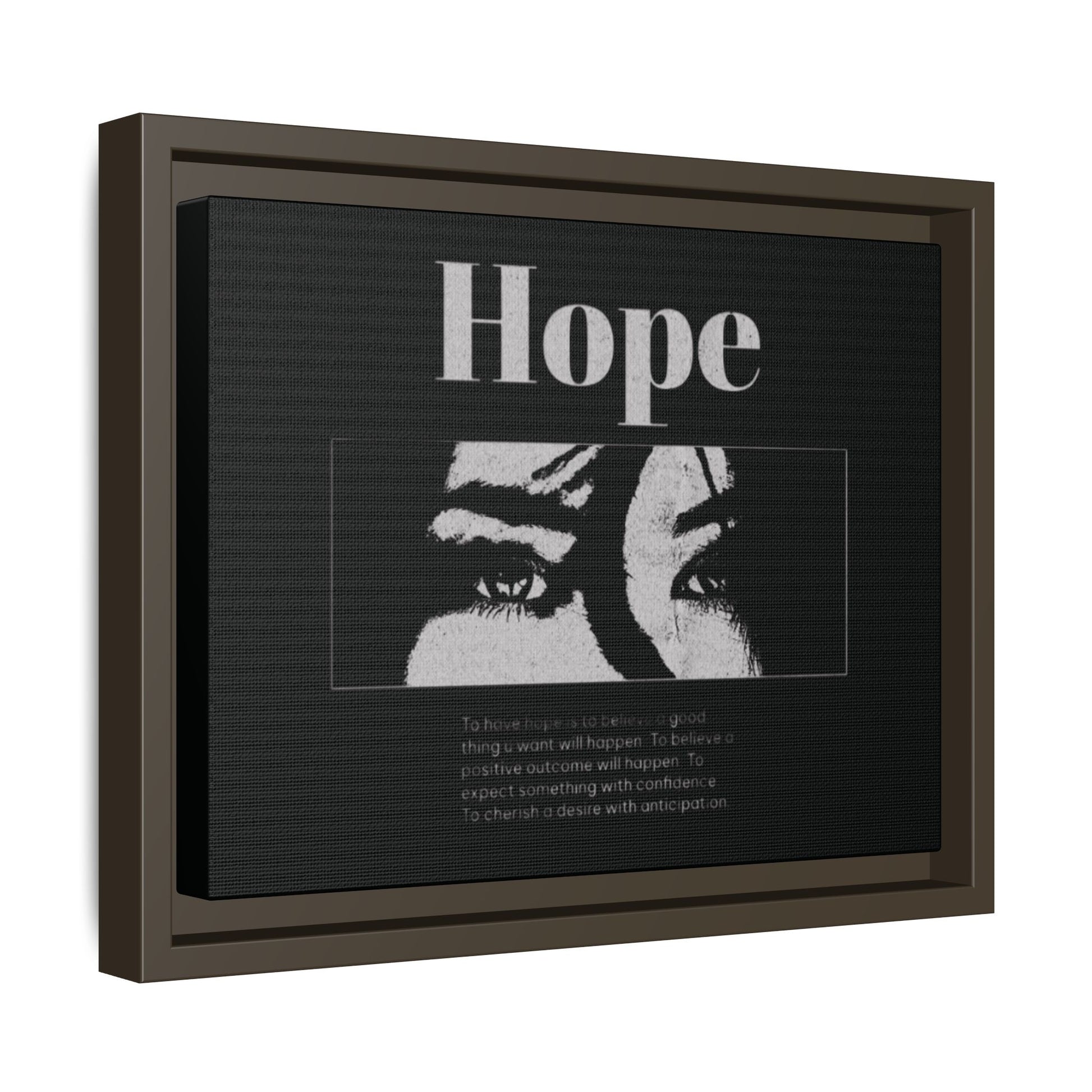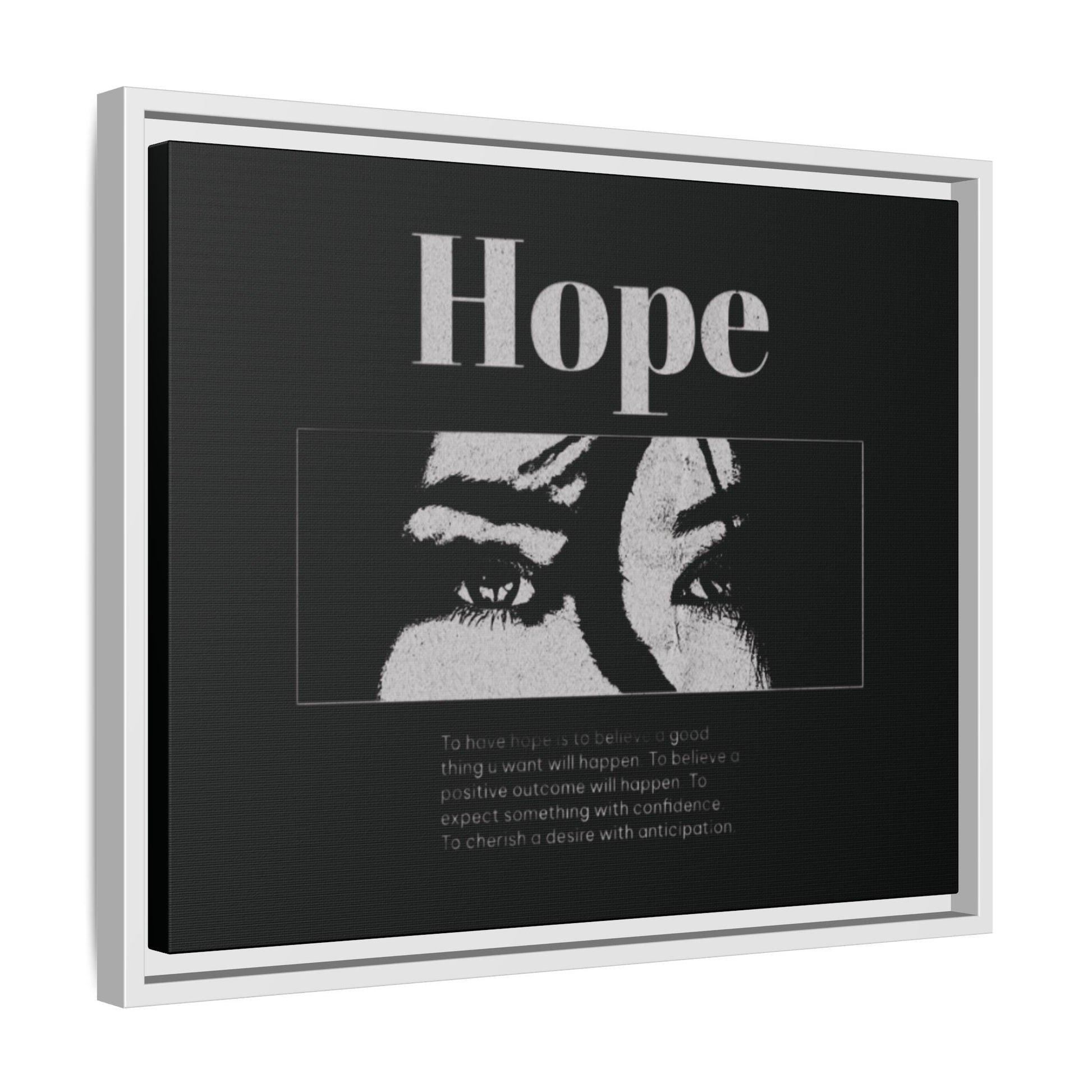 With shadowed eyes and bold serif lettering, this striking piece titled Hope captures the tension of expectancy in a broken world. The grayscale design, centered on a solemn gaze, anchors you in the quiet belief that something better is always coming.