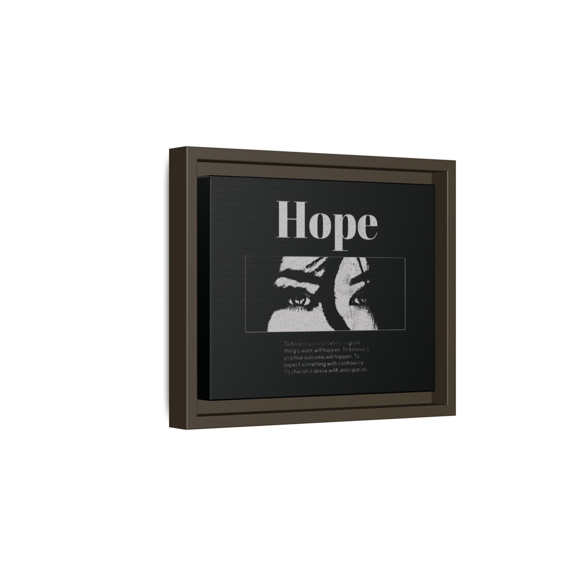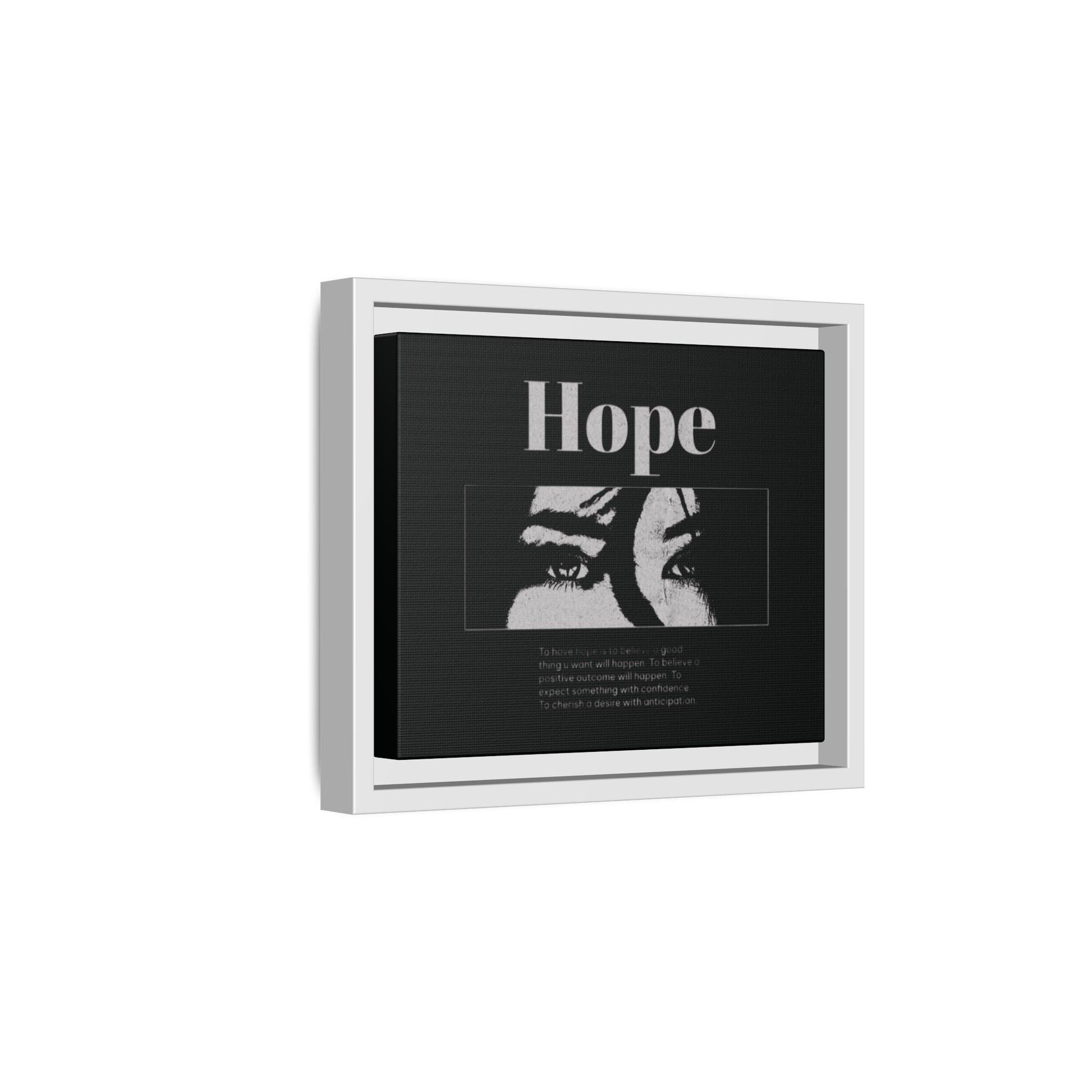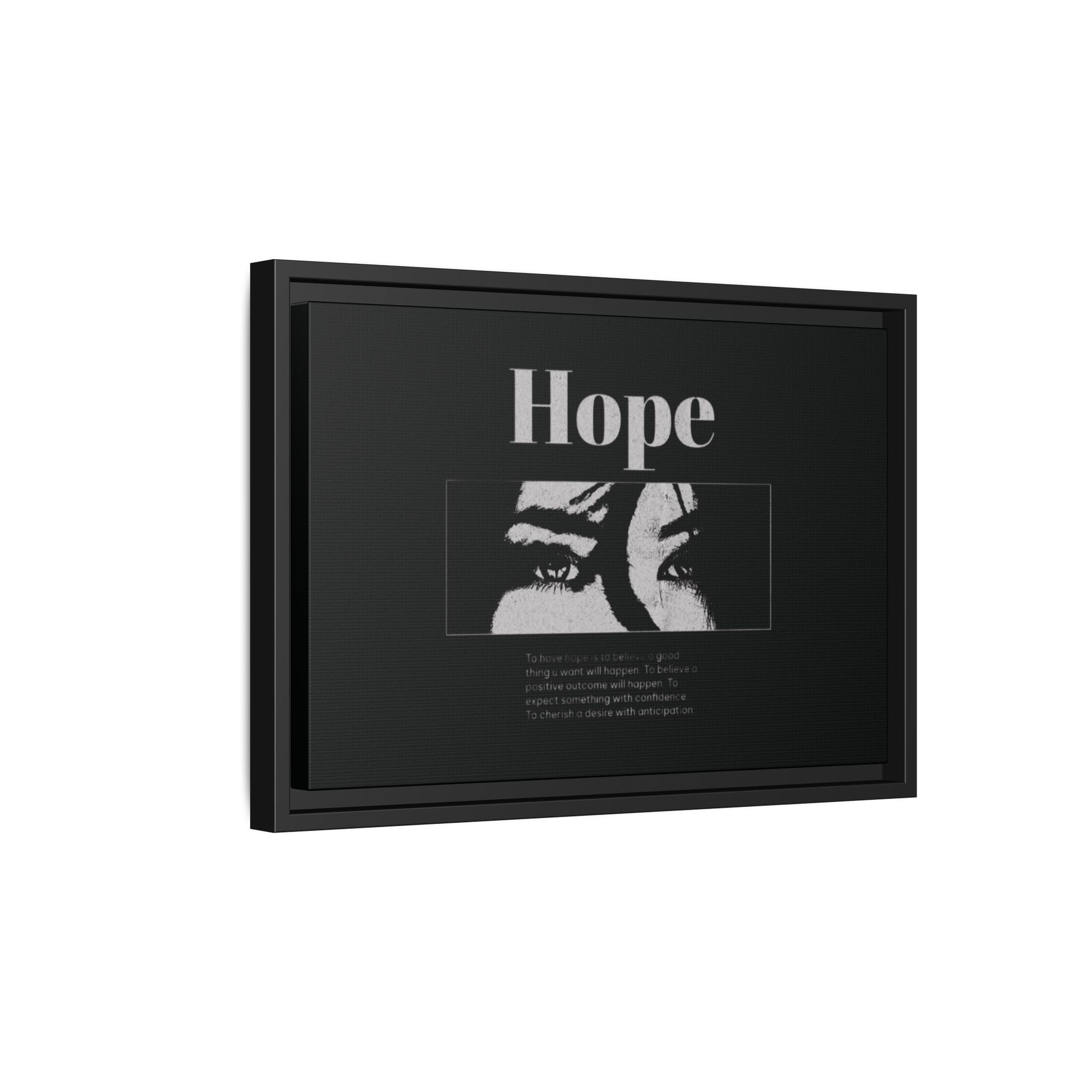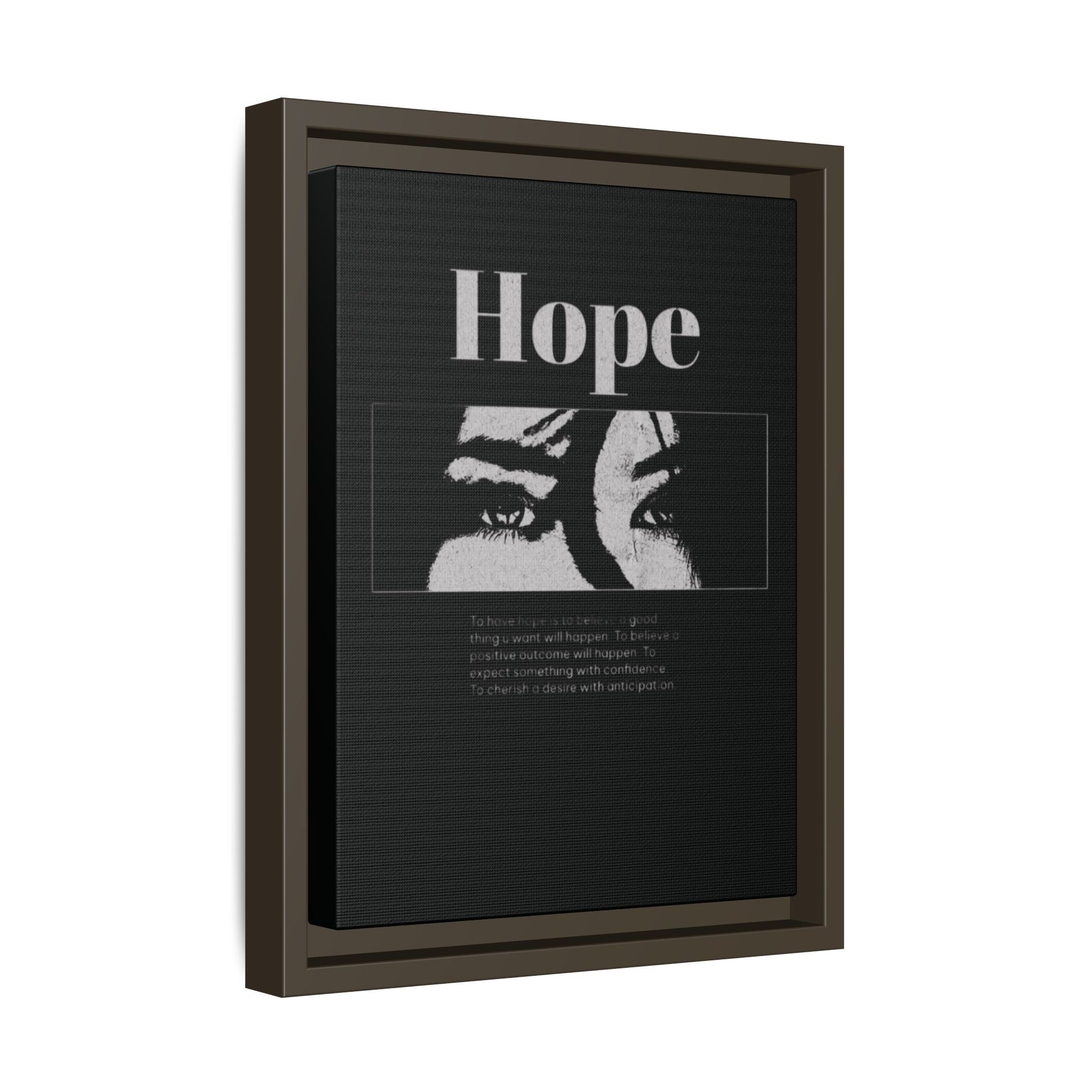 With shadowed eyes and bold serif lettering, this striking piece titled Hope captures the tension of expectancy in a broken world. The grayscale design, centered on a solemn gaze, anchors you in the quiet belief that something better is always coming.