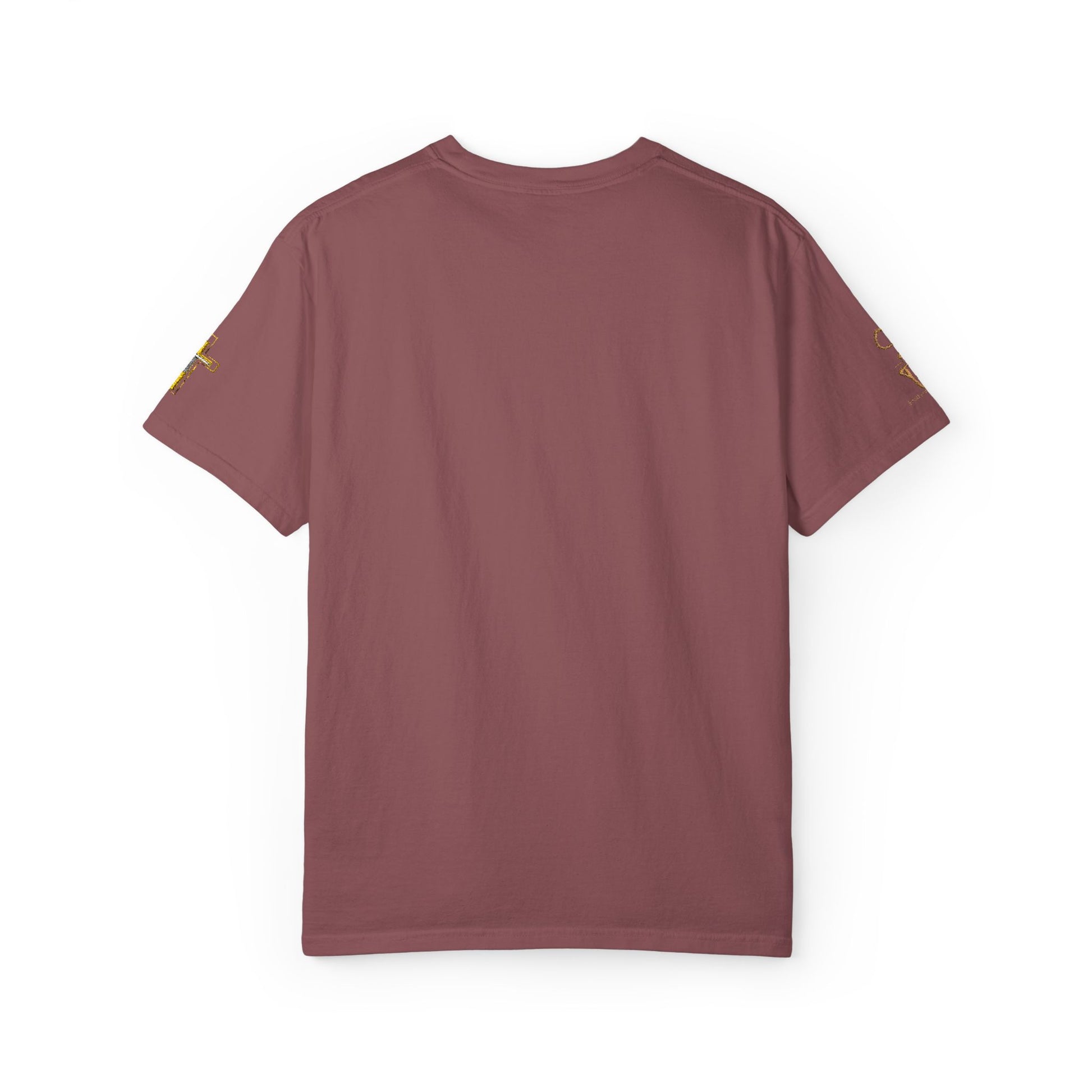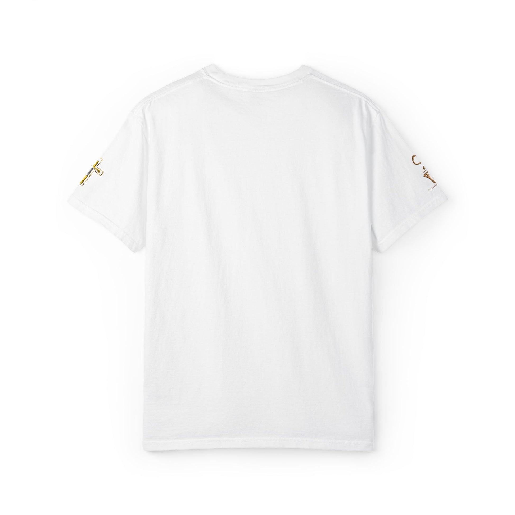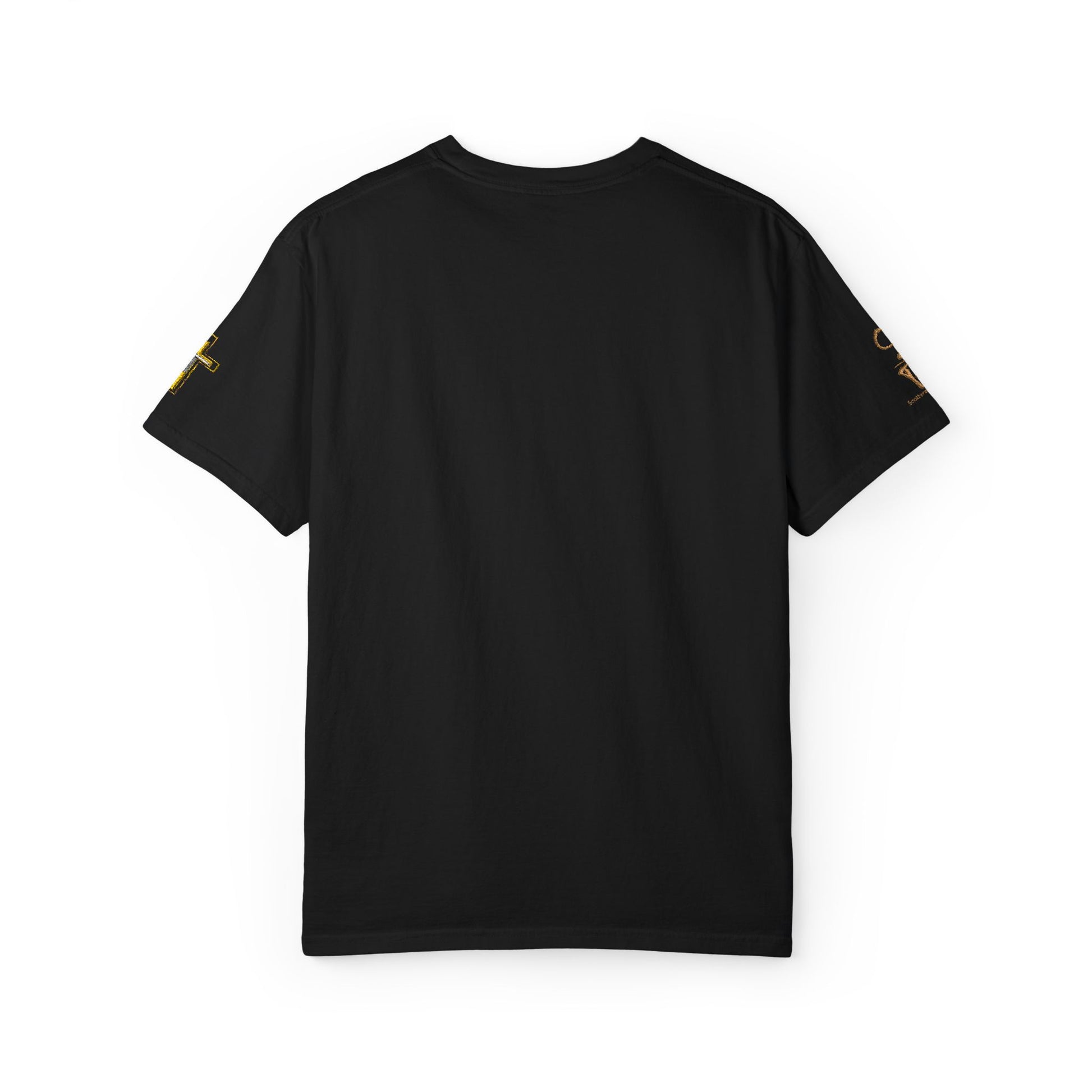 Featuring gold pixel-style text across the chest and subtle cross hits on each sleeve, this design is both declarative and dignified. Whether you’re dressing it up under a jacket or rocking it solo, this piece turns heads while reminding hearts of the truth: your existence is not an accident.