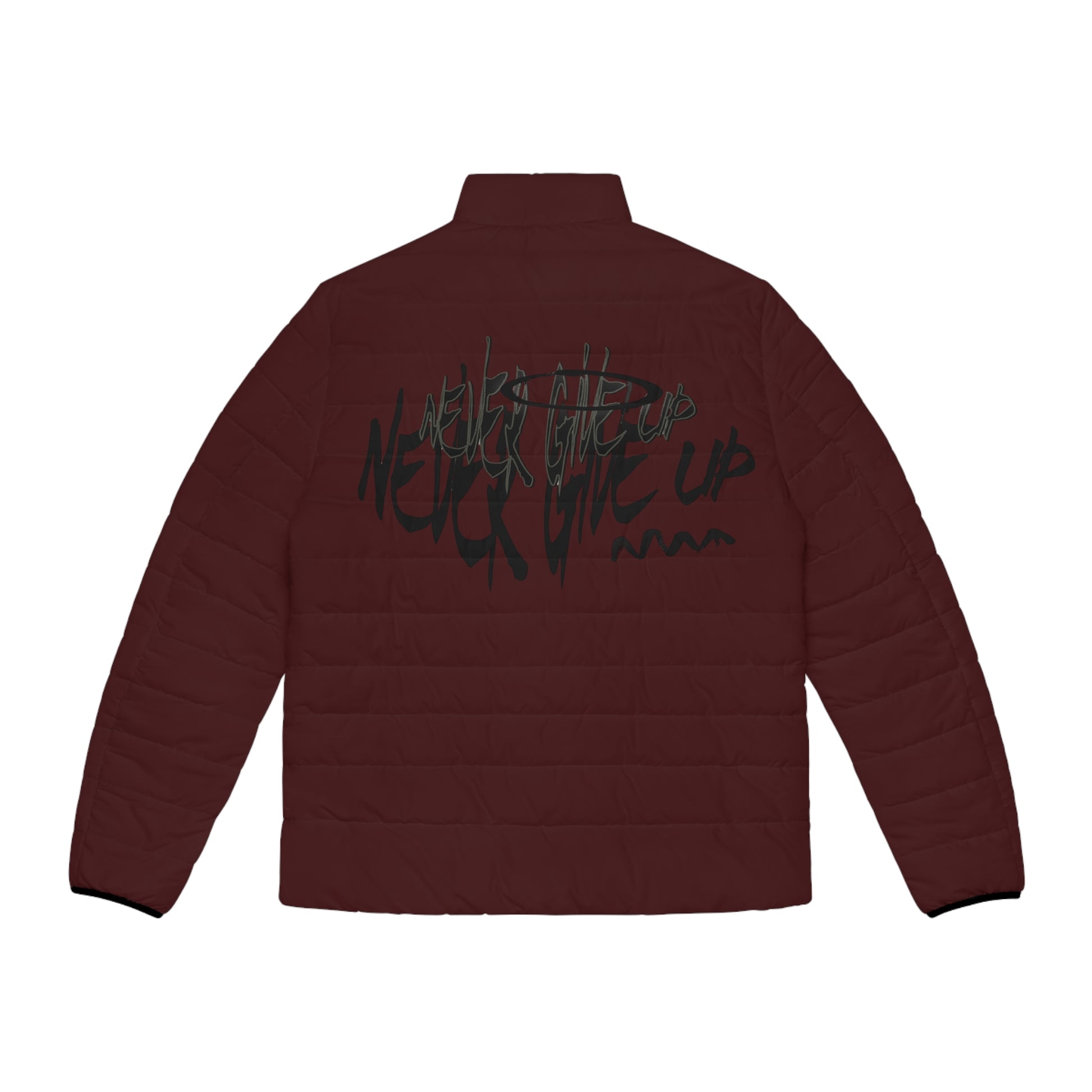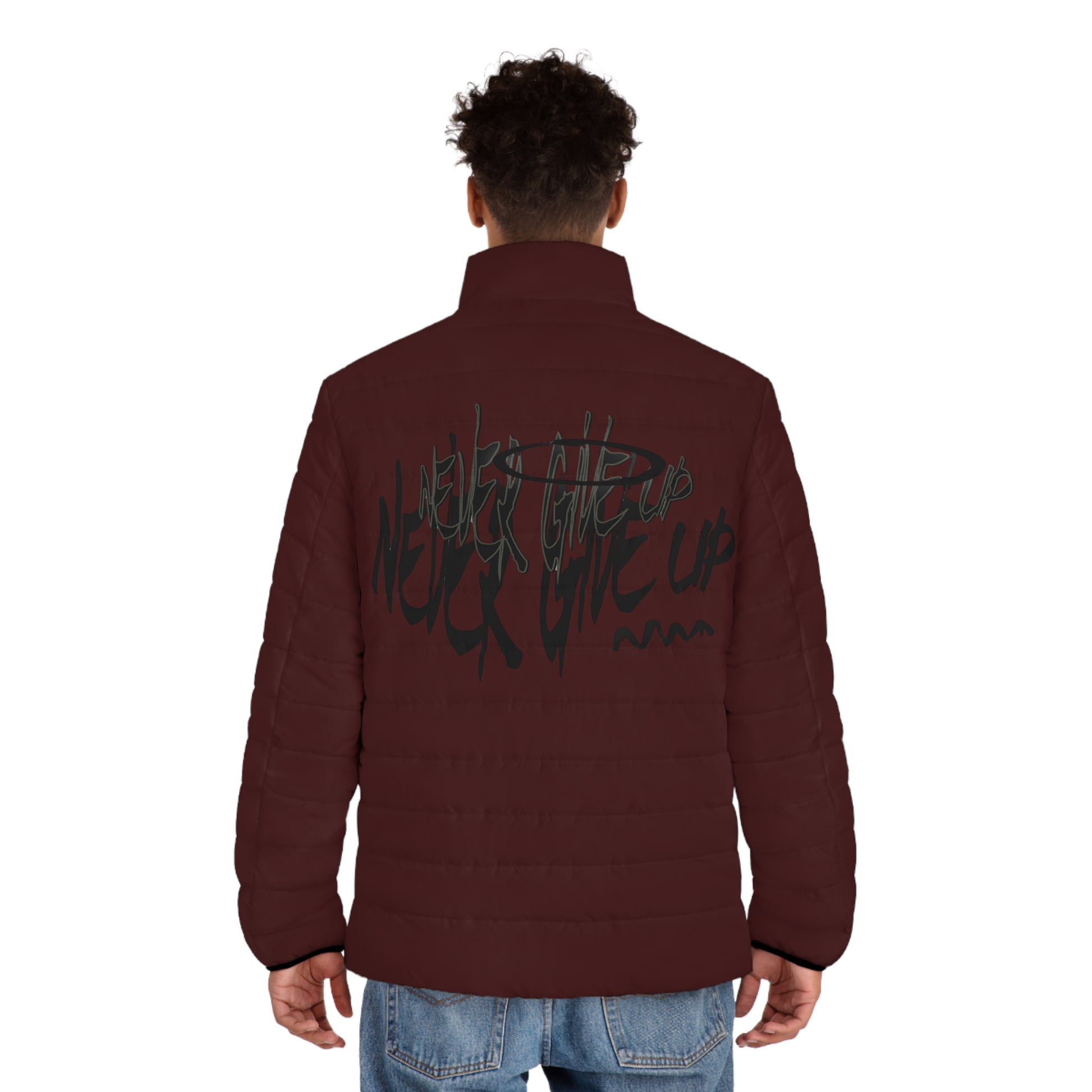 The Never Give Up Essentials Men’s Puffer Jacket is more than outerwear—it’s a declaration of endurance. Designed in deep maroon with bold graffiti-style script across the back, this jacket speaks resilience into every step: “Never Give Up.”
