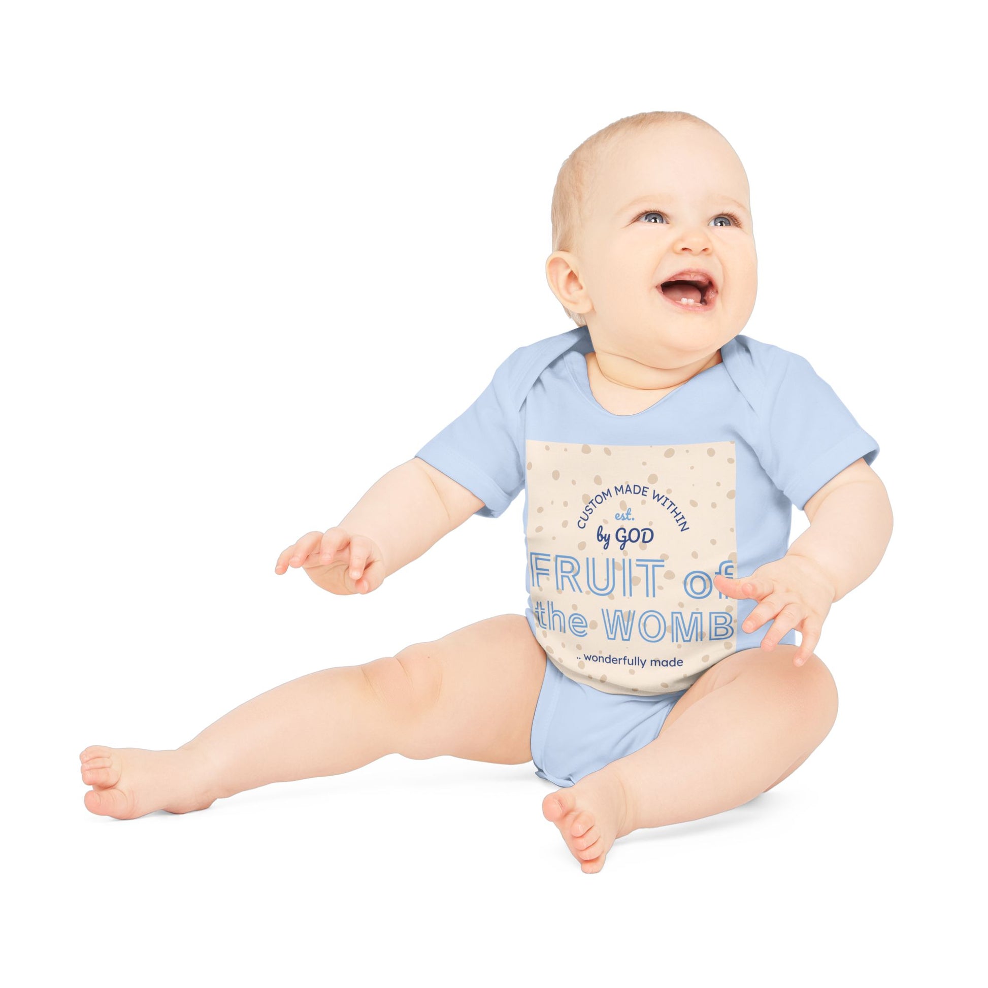Wonderfully made and handcrafted by the Creator Himself — this baby onesie is more than cute, it’s a declaration of divine purpose. Featuring the faith-filled phrase “Fruit of the Womb – Custom Made Within by God” on a soft sandstone sprinkle background, this design ties beautifully into the rest of the collection. Cozy, uplifting, and full of truth — it’s a wearable reminder that your little one is a precious, God-designed miracle.