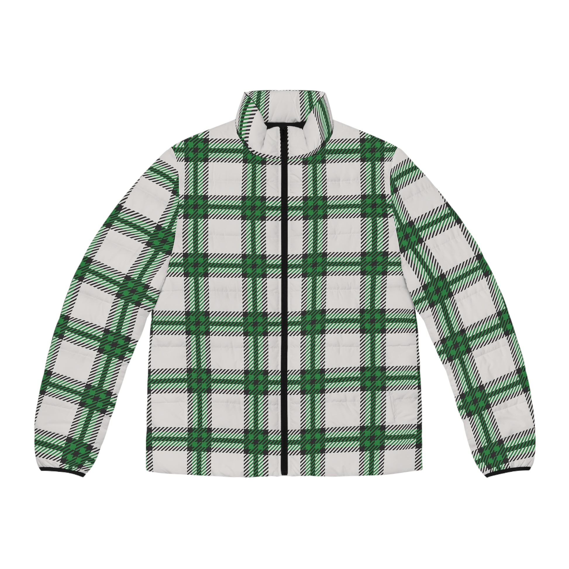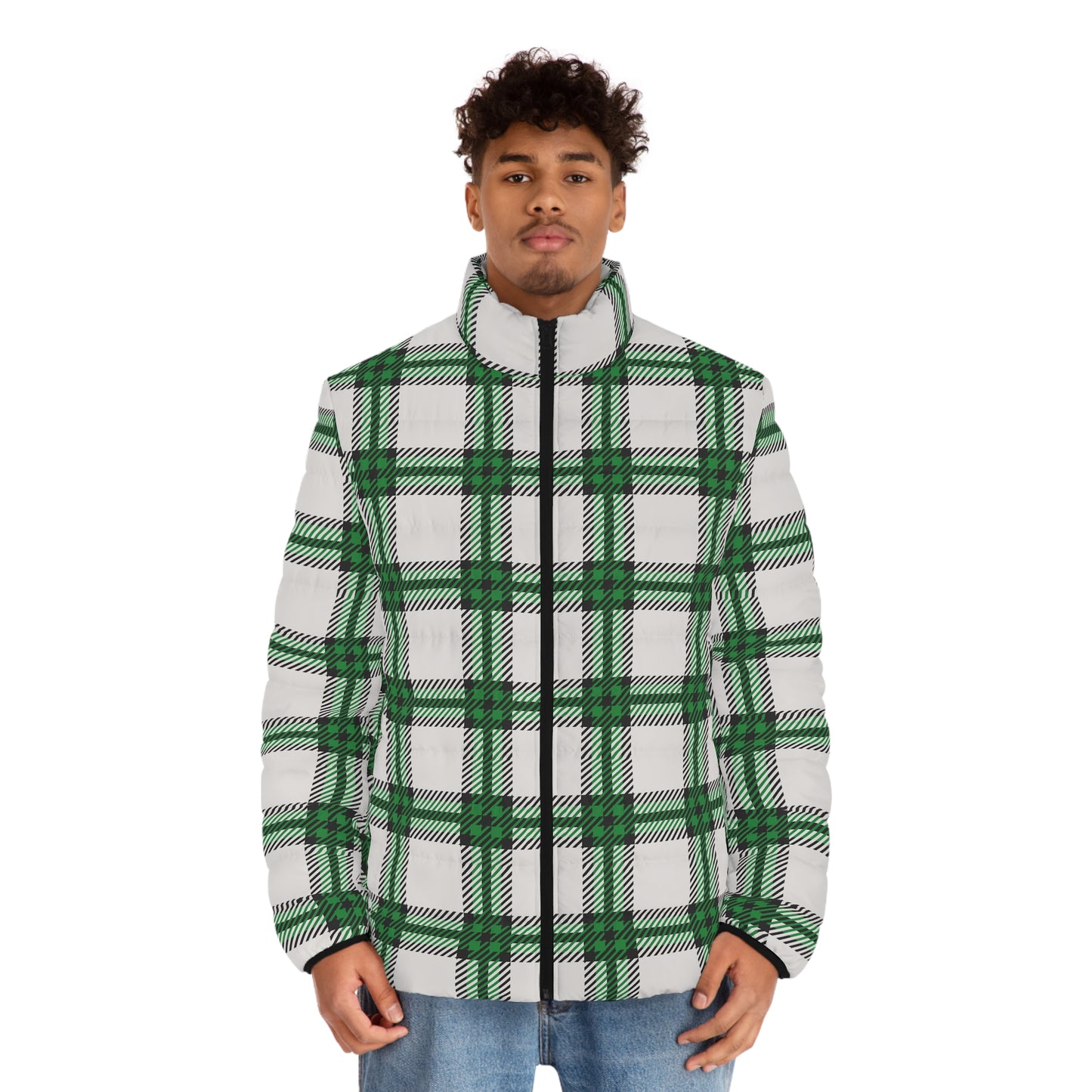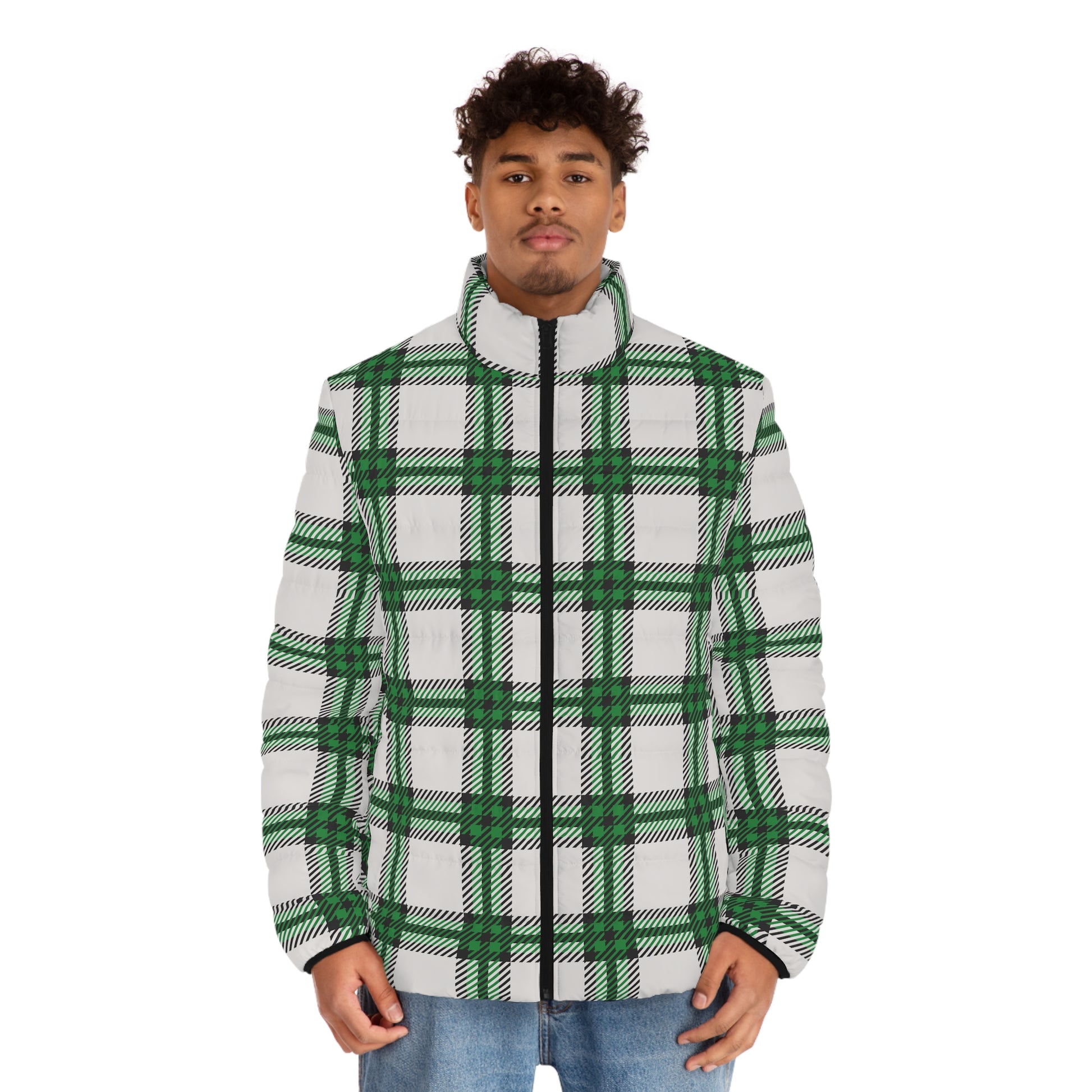 Cloaked in conviction and crafted for the cold, the Shadow Glen men’s puffer is your armor for the season. This striking outerwear piece from the Whispers of Winter: FW25 Collection features an oversized forest plaid pattern in deep green, crisp white, and bold black—symbolic of clarity, growth, and grounded faith.
