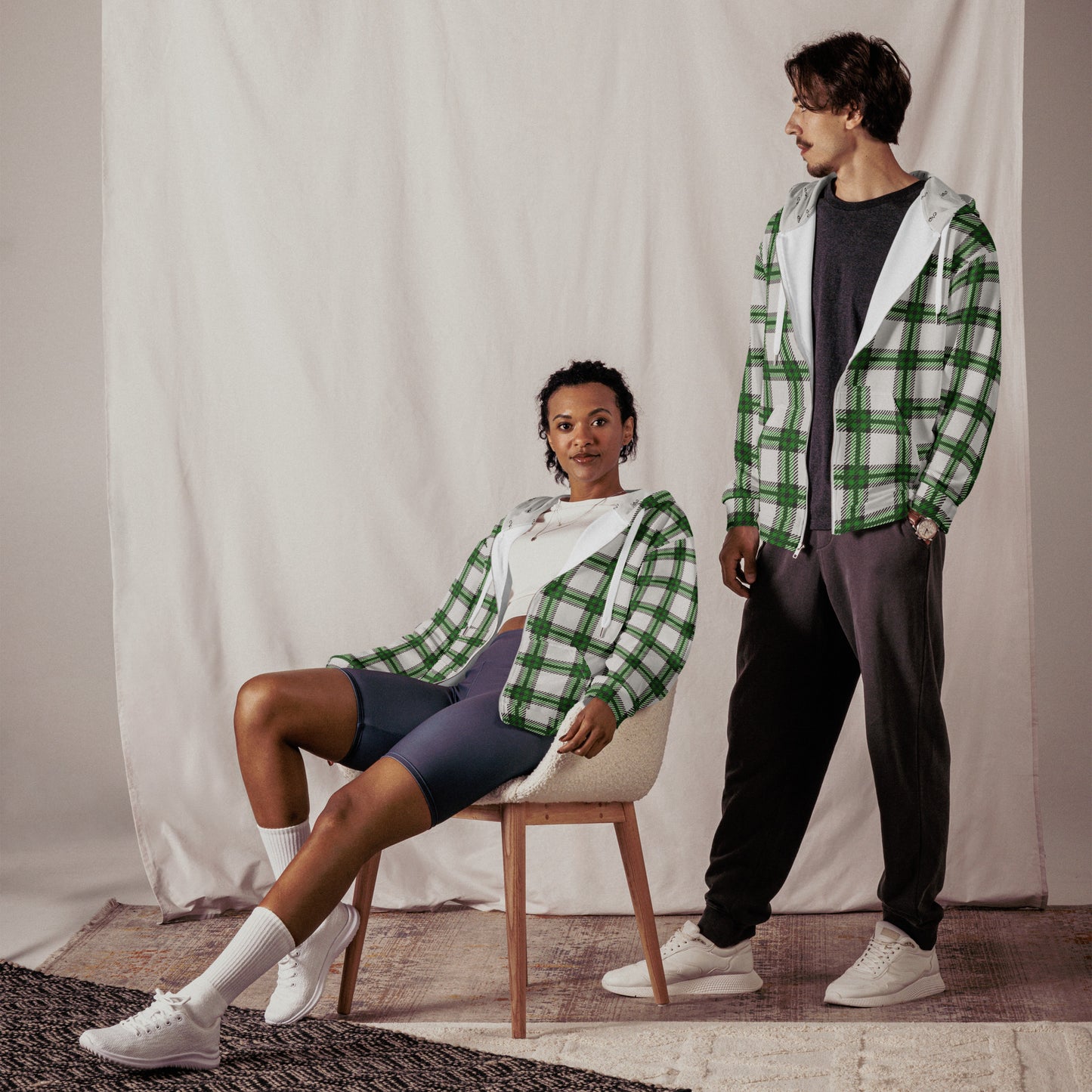 The Shadow Glen Unisex Zip Hoodie is a quiet storm—classic in silhouette, bold in meaning. Featuring the signature forest green and charcoal black plaid from the Whispers of Winter FW25 collection, this full-zip layer is designed for motion, meditation, and message-driven living.