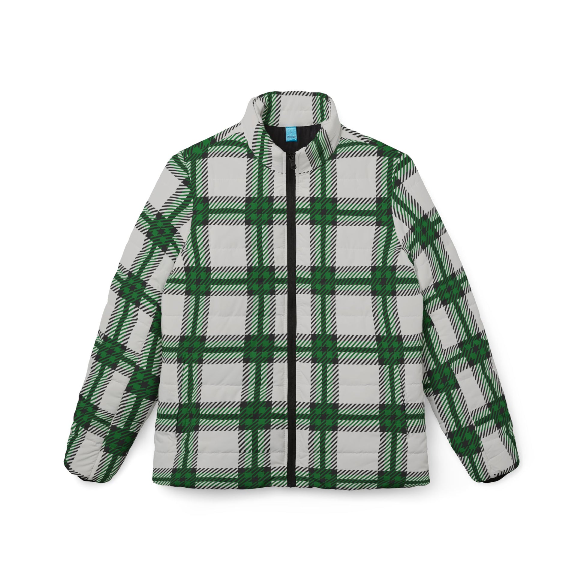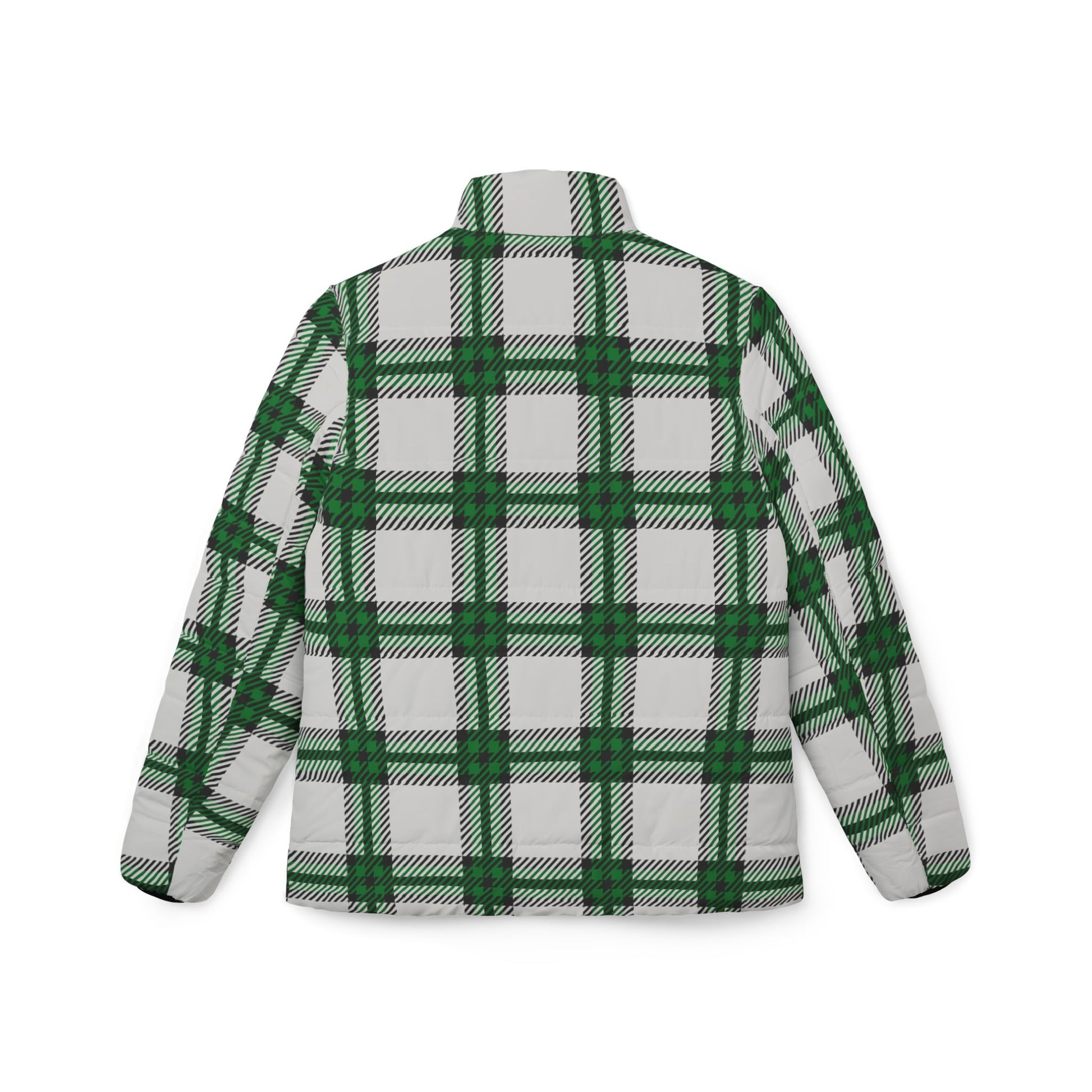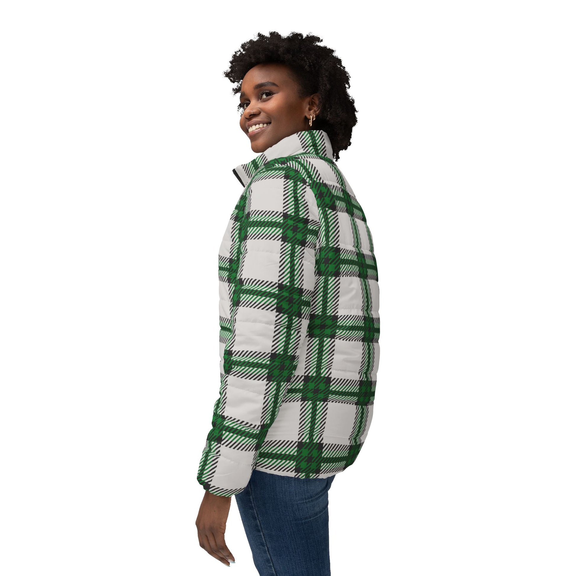 Step boldly into the stillness of the season with the Shadow Glen women’s puffer — a visual prayer wrapped in plaid. Featuring a bold yet elegant green-and-black tartan on a soft winter white base, this FW25 hero piece radiates strength in serenity.
