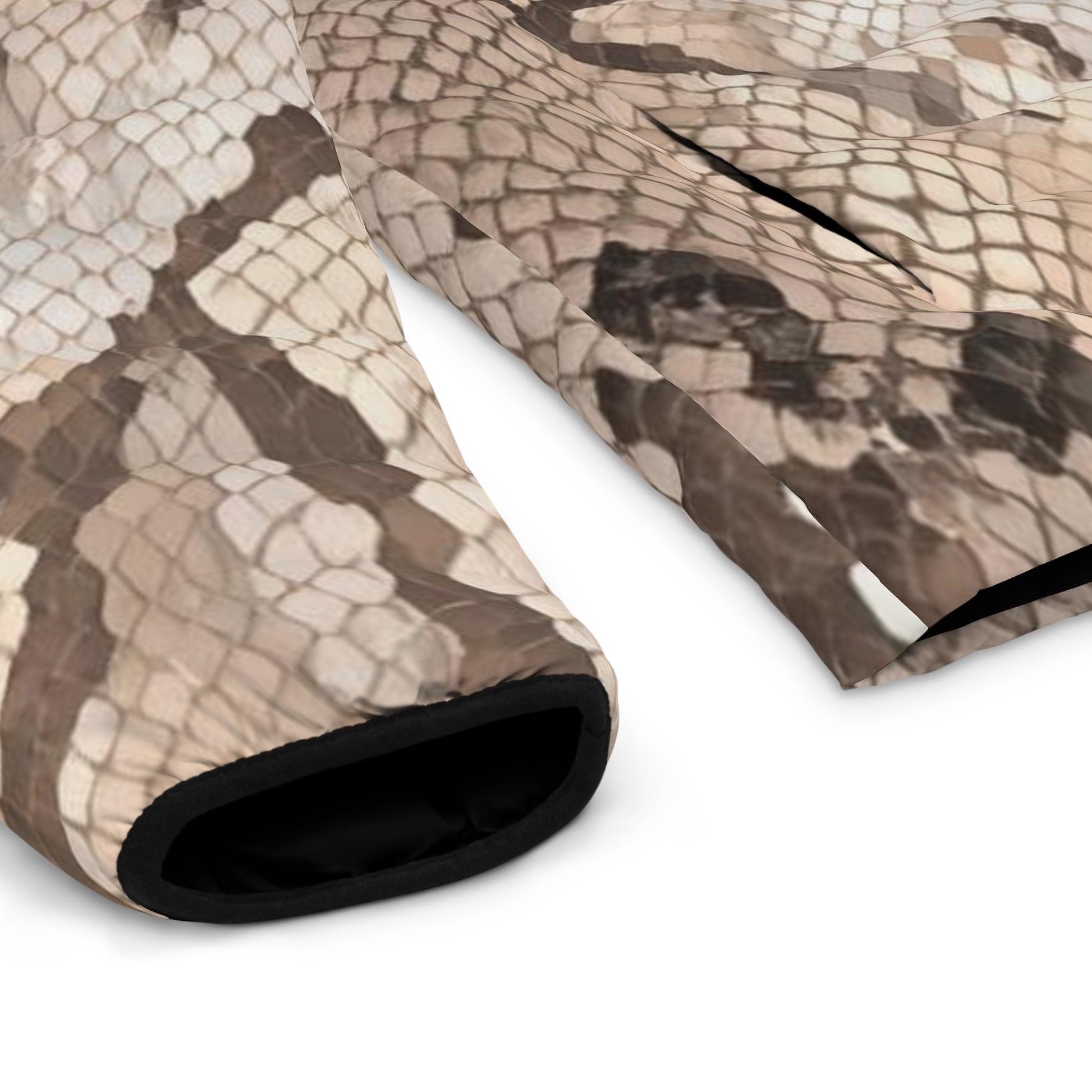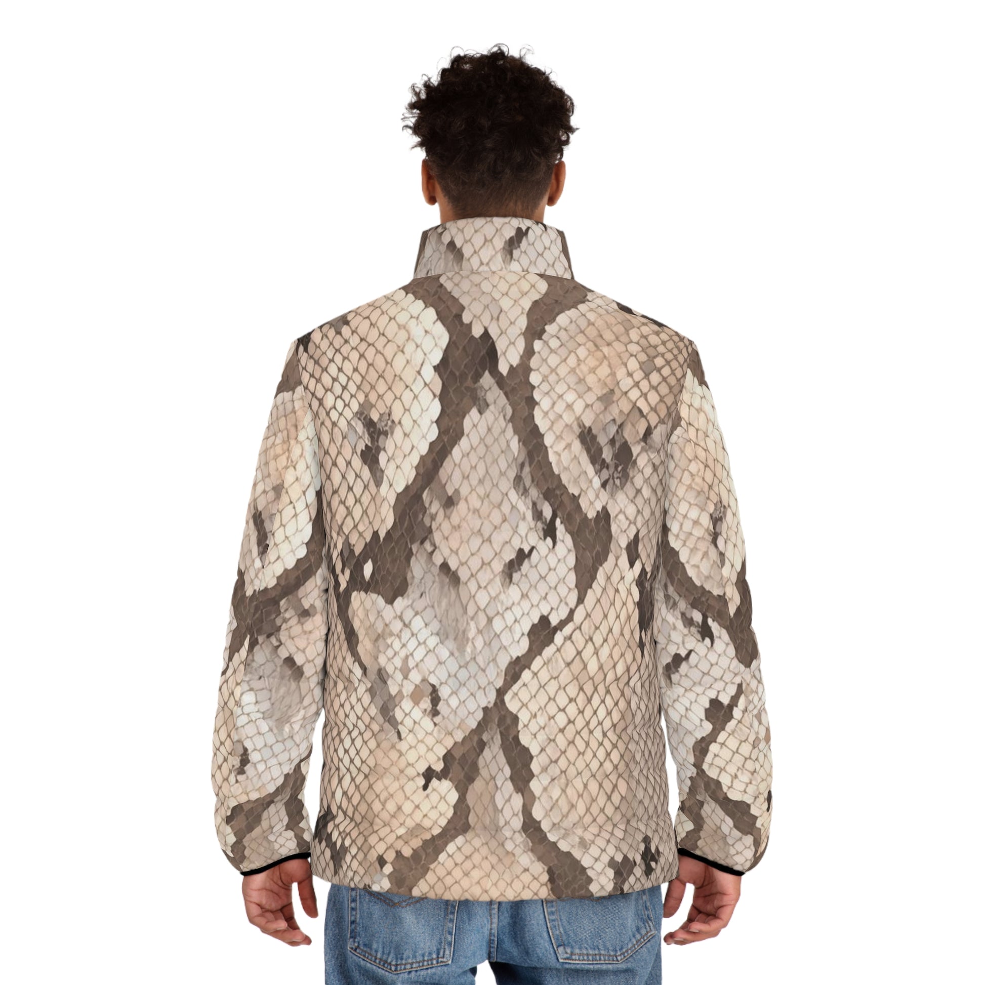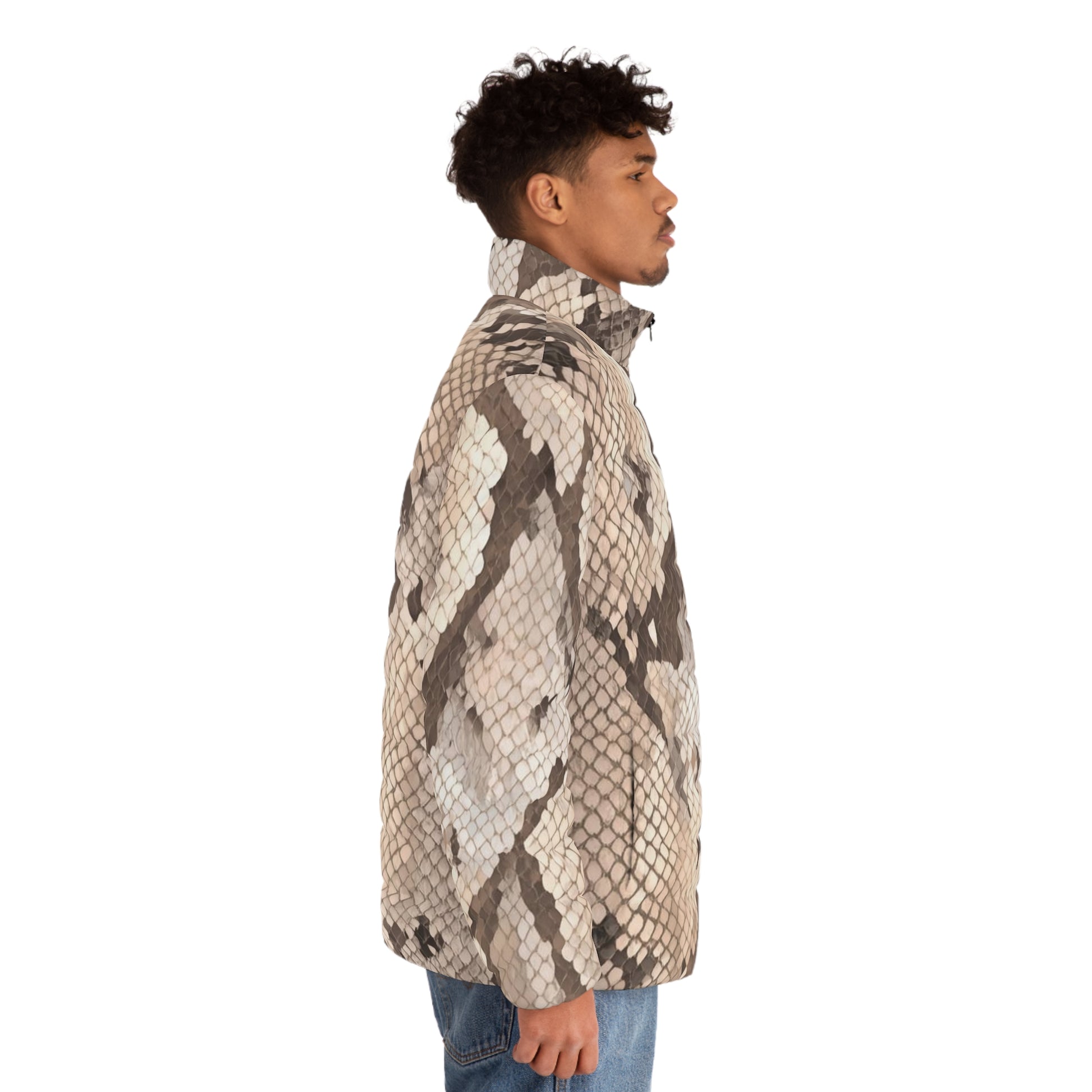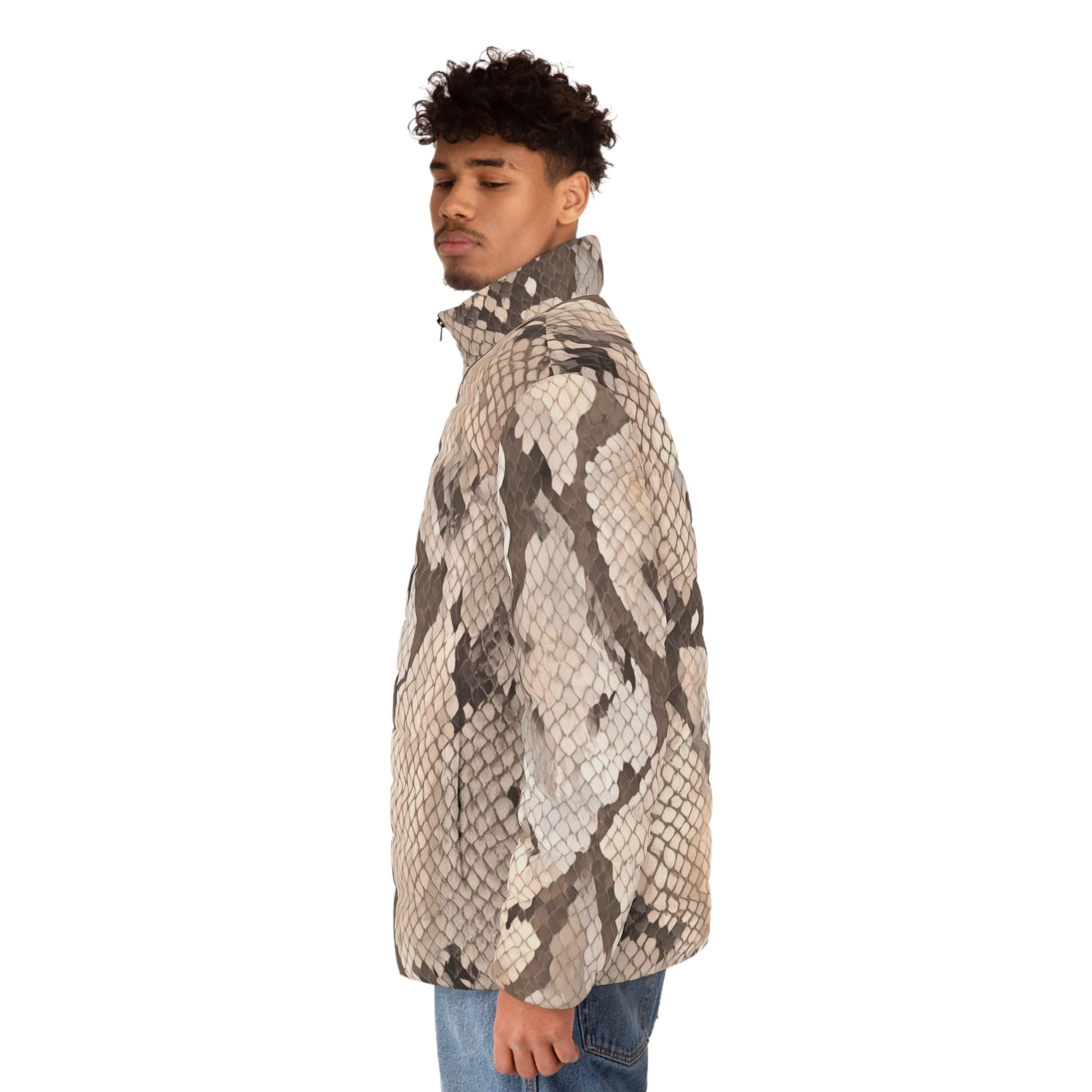 The Shed Light men’s puffer speaks to the ones who’ve outgrown the old and refuse to walk in shadows. Its sleek snakeskin-inspired print — rich with tones of charcoal black, warm pewter, and muted gold — symbolizes spiritual discernment, shedding past limitations, and stepping boldly into light and clarity.