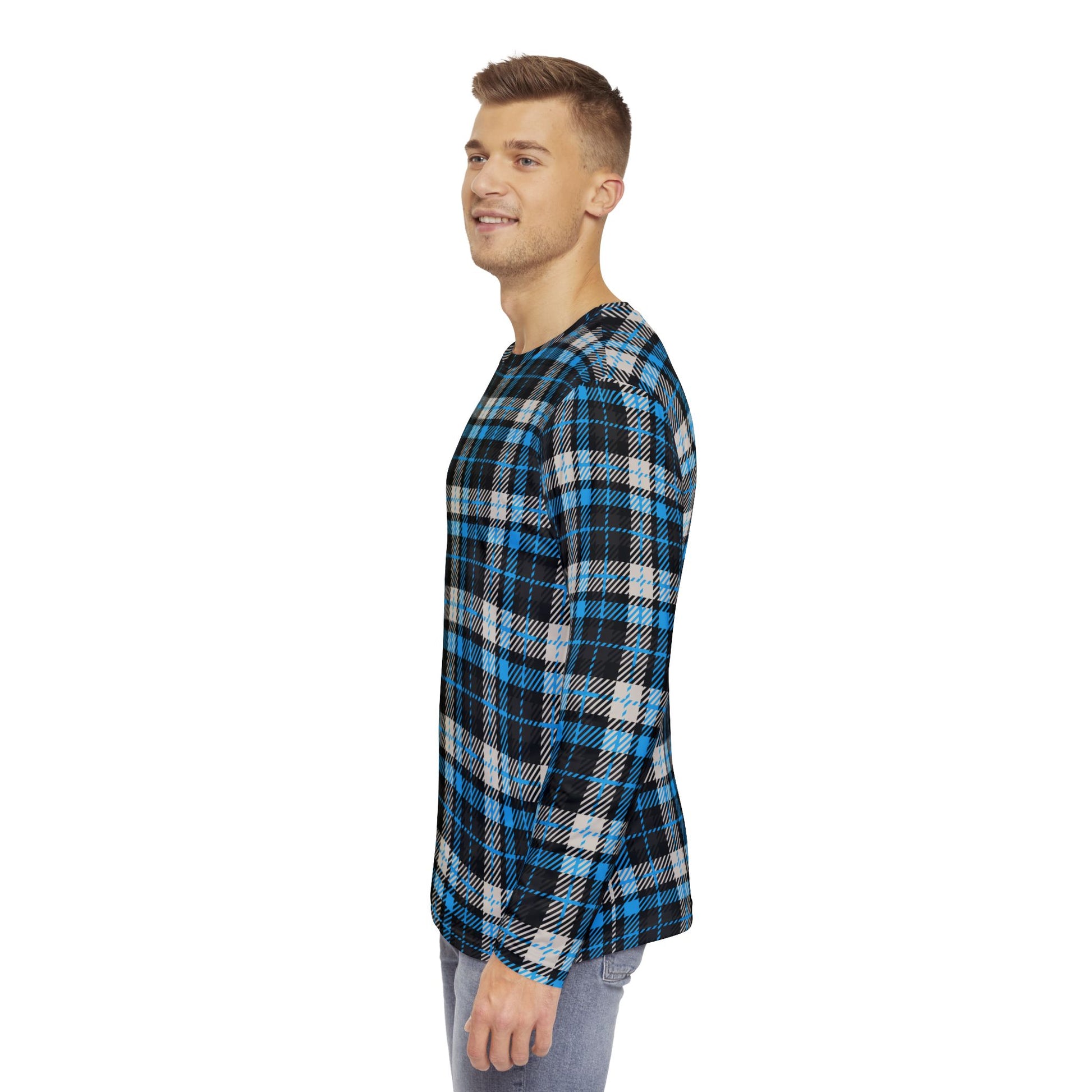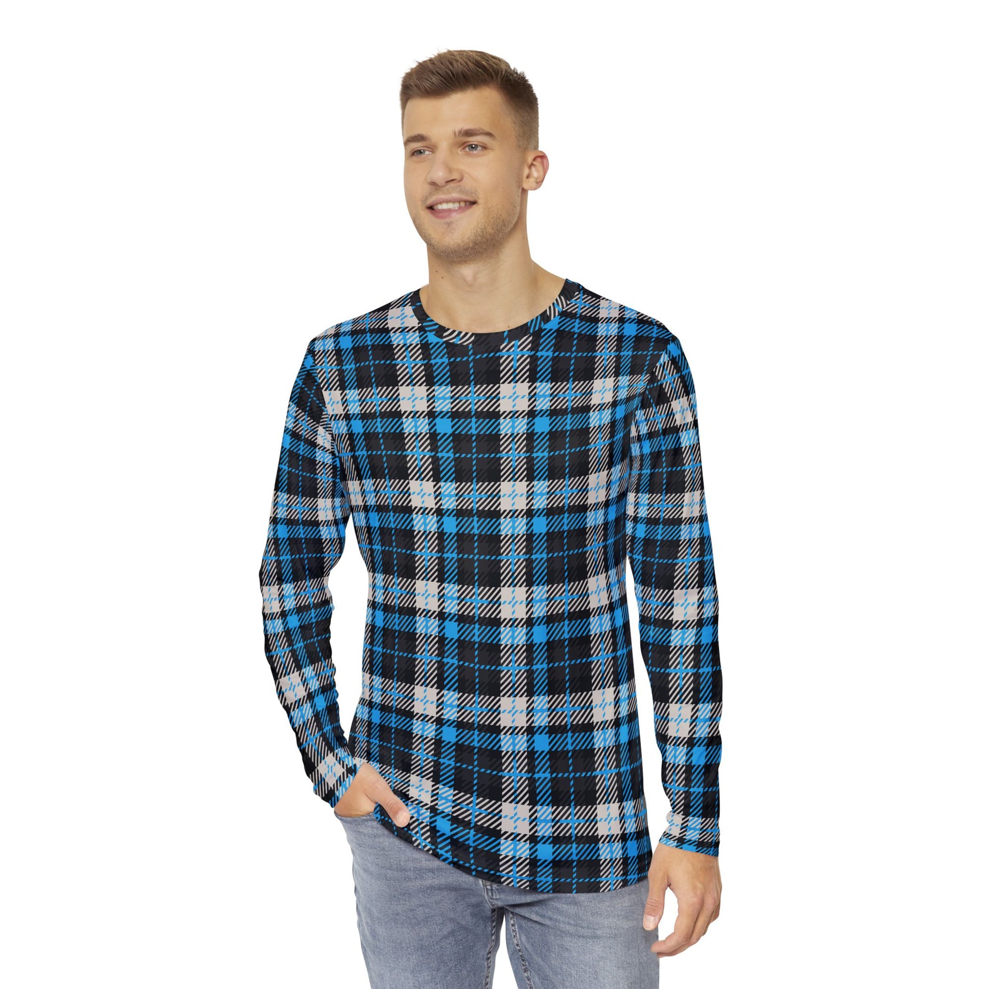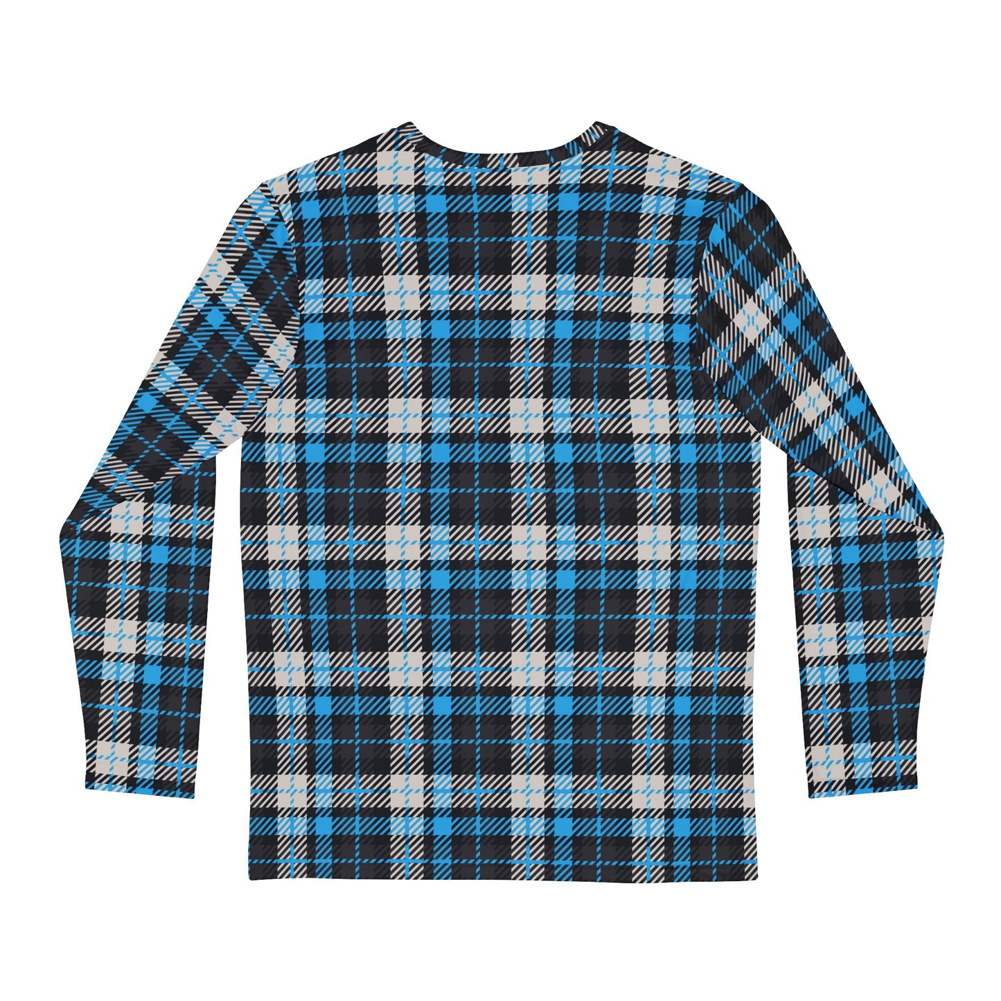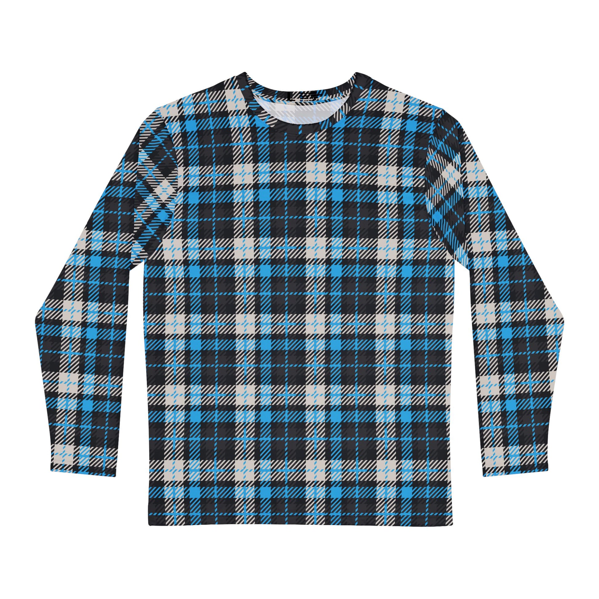 This Silent Crossing Men’s Long Sleeve says everything without saying a word—draped in a plaid of gamma blue, stone beige, and charcoal black that commands presence with quiet strength.