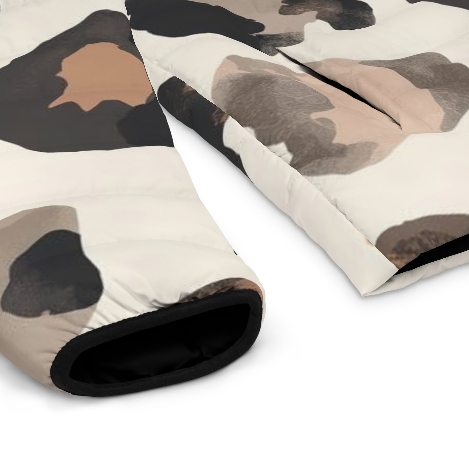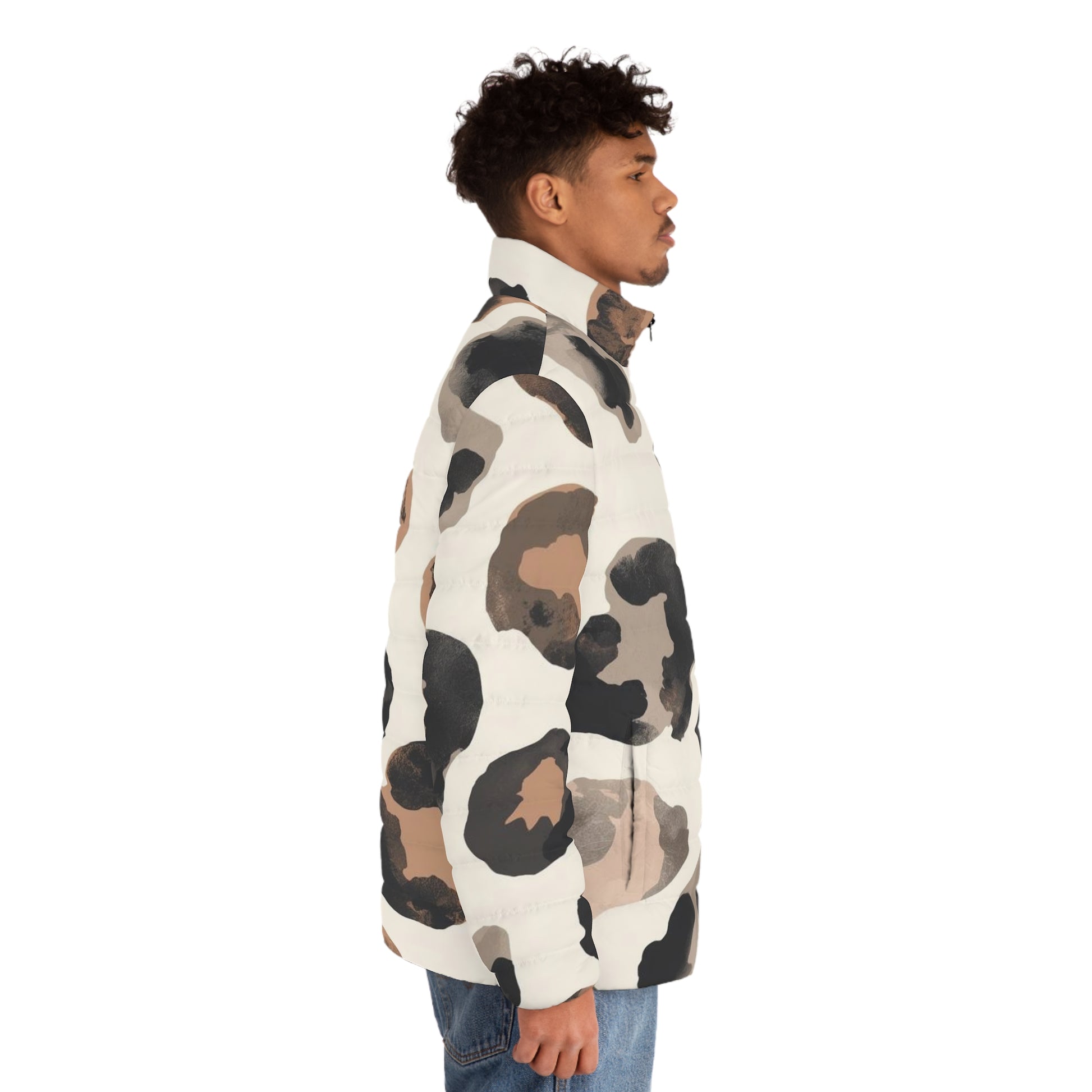 The Soft Roar puffer doesn’t shout — it radiates. Crafted for the man who leads with peace but walks with presence, this jacket blends comfort, clarity, and quiet command. The smooth leopard-inspired print in warm taupe, cream, and deep mocha speaks to the strength of a spirit that doesn't need noise to be noticed.